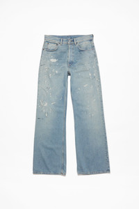 2021 jeans are cut to a loose fit with mid-waist, wide leg and long length. Made from rigid denim in a light blue wash with tinted and painted mark detailings. - Loose fit - Mid waist - Wide leg - Long length - 5-pocket construction - Button fly - Made in Italy - Model is 189 cm / 6'2 and wears a size 29/34 - Style ID: Acne Studios 2021M Trafalgar - Made from organically grown cotton. - Shell: 60% Cotton, 40% Lyocell, Patch: 100% Cow leather