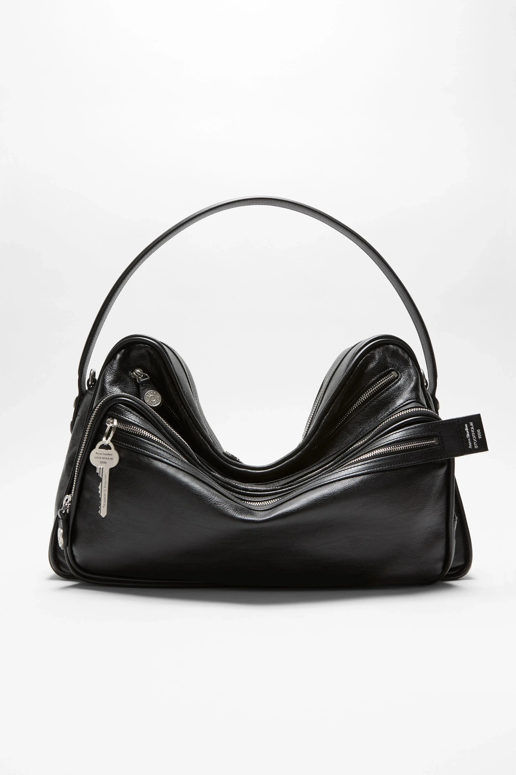 The Camero bag features a multipocket typology with a soft, rectangular design and a compact, structured silhouette. Accented with multiple zip compartments, branded key charm and signature denim-style button logo detail accents. Complete with a drop handle and adjustable crossbody strap for seamless wear. Bag is styled with accentuated shape to give it a modern, relaxed attitude through its distinctive collapsed silhouette. - Drop handle and adjustable crossbody strap - Acne Studios logo embossed - Silver-toned zip compartments and denim-style button - Branded key charm - Measurements: 280mm; 420mm; 110mm - Drop handle measurements: 8cm, max - Crossbody strap measurements: Adjustable 42 cm to 65 cm - Style ID: Camero Camera - Shell: 100% Preferred calf leather, Lining: 50% Polyurethane, 50% Polyester