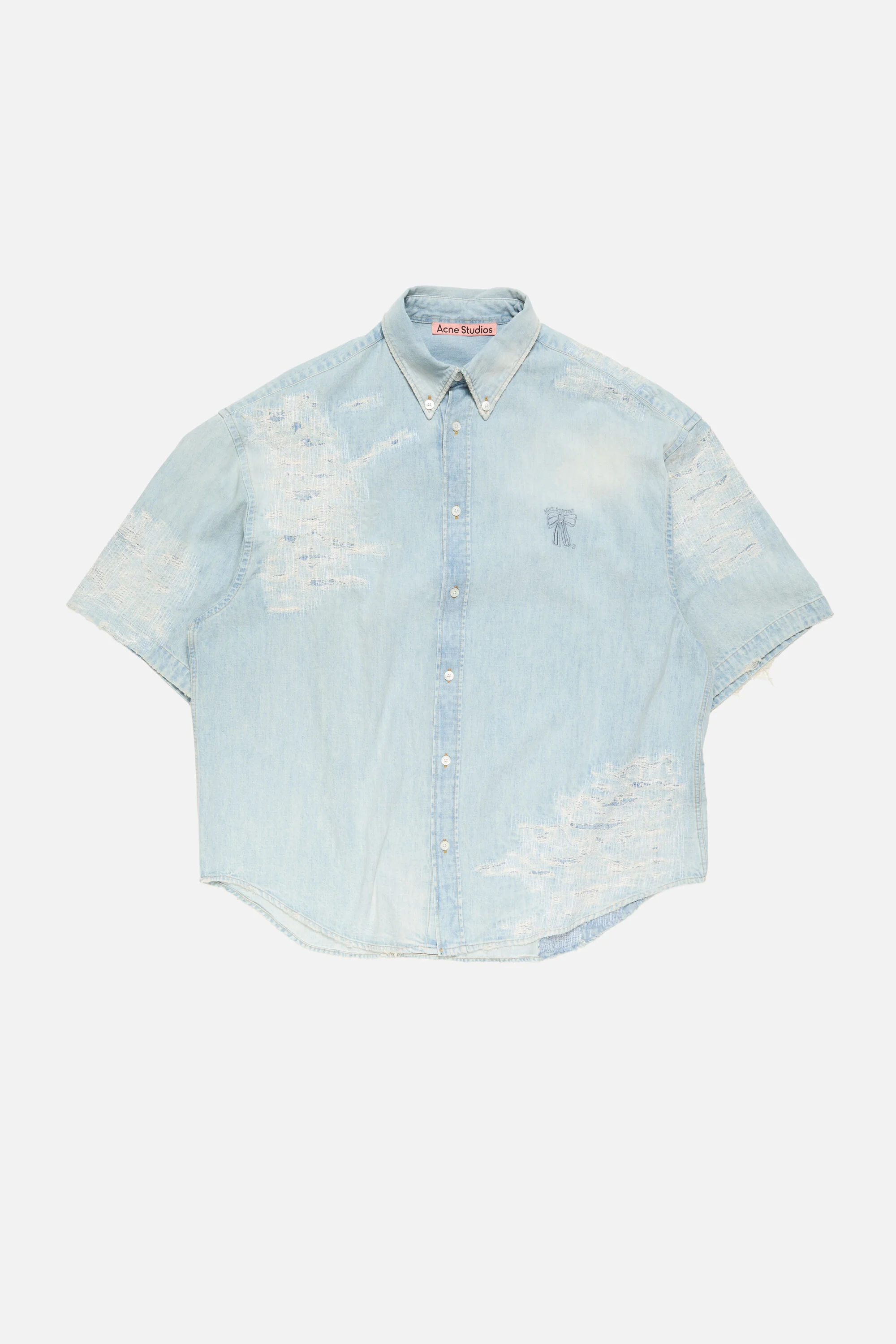 Short-sleeve button-up shirt crafted from denim with a classic collar, featuring mended details and finished with an embroidered bow logo on the chest. Cut to a relaxed fit with a hip-length silhouette. - Denim button-up shirt - Relaxed fit - Hip-length - Short sleeves - Classic collar - Mended details - Embroidered bow logo - Model is 190 cm / 6'2 and wears a 46 - Style ID: FN-MN-SHIR000978 - Made from organically grown cotton - Shell: 100% Cotton