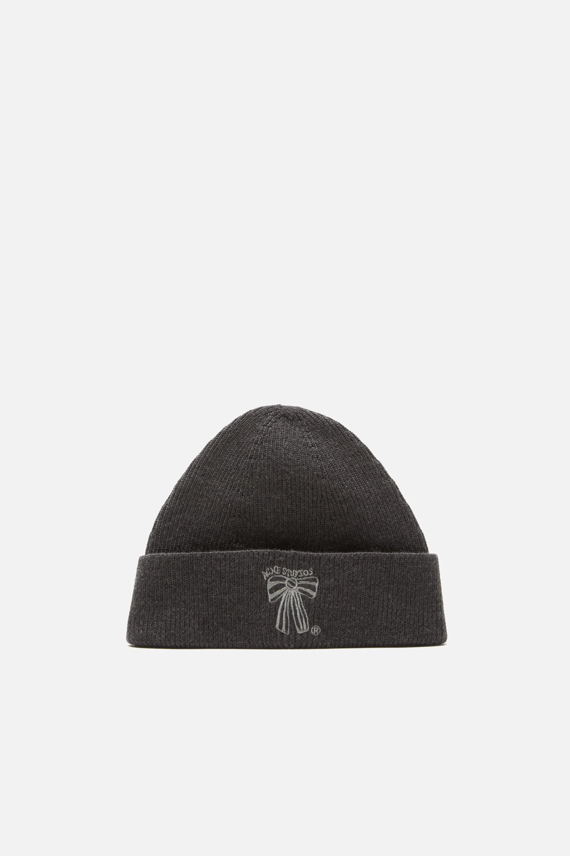 Ribbed knit beanie crafted from soft merino wool. Featuring small embroidered bow on upturned edge. - Ribbed merino wool - Small embroidered bow - Upturned edge - Measurements: 59 cm approx. - Style ID: FN-UX-HATS000345 - Certified to the Responsible Wool Standard (RWS) by Control Union, license number CU-1024001. - Shell: 3% Nylon, 1% Elastane, 96% Wool