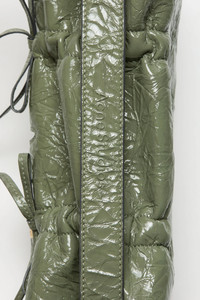 Multipocket shoulder bag crafted from shiny, crinkled leather with a multi-pocket construction and spacious interior. Features a top handle and adjustable shoulder strap, accented with jean-inspired rivets and knot details on the pockets, secured with magnetic closures. - Shoulder bag - Multi-pocket construction - Knot details on pocket flaps - Jeans-inspired rivets on pocket flaps - Top handle - Adjustable shoulder strap - Measurements: 130 × 330 × 110 mm - Longer strap: 72 cm; drop: 28 cm - Shorter strap: 45 cm; drop: 11 cm - Handle width: 3 cm - Protective dustbag - Made in Italy - Style ID: Multipocket Crinkled Patent S - Shell made from leather from a Leather Working Group (LWG) certified tannery with Silver rating. - Shell: 100% Goat leather, Lining: 50% Polyester, 50% Polyurethane
