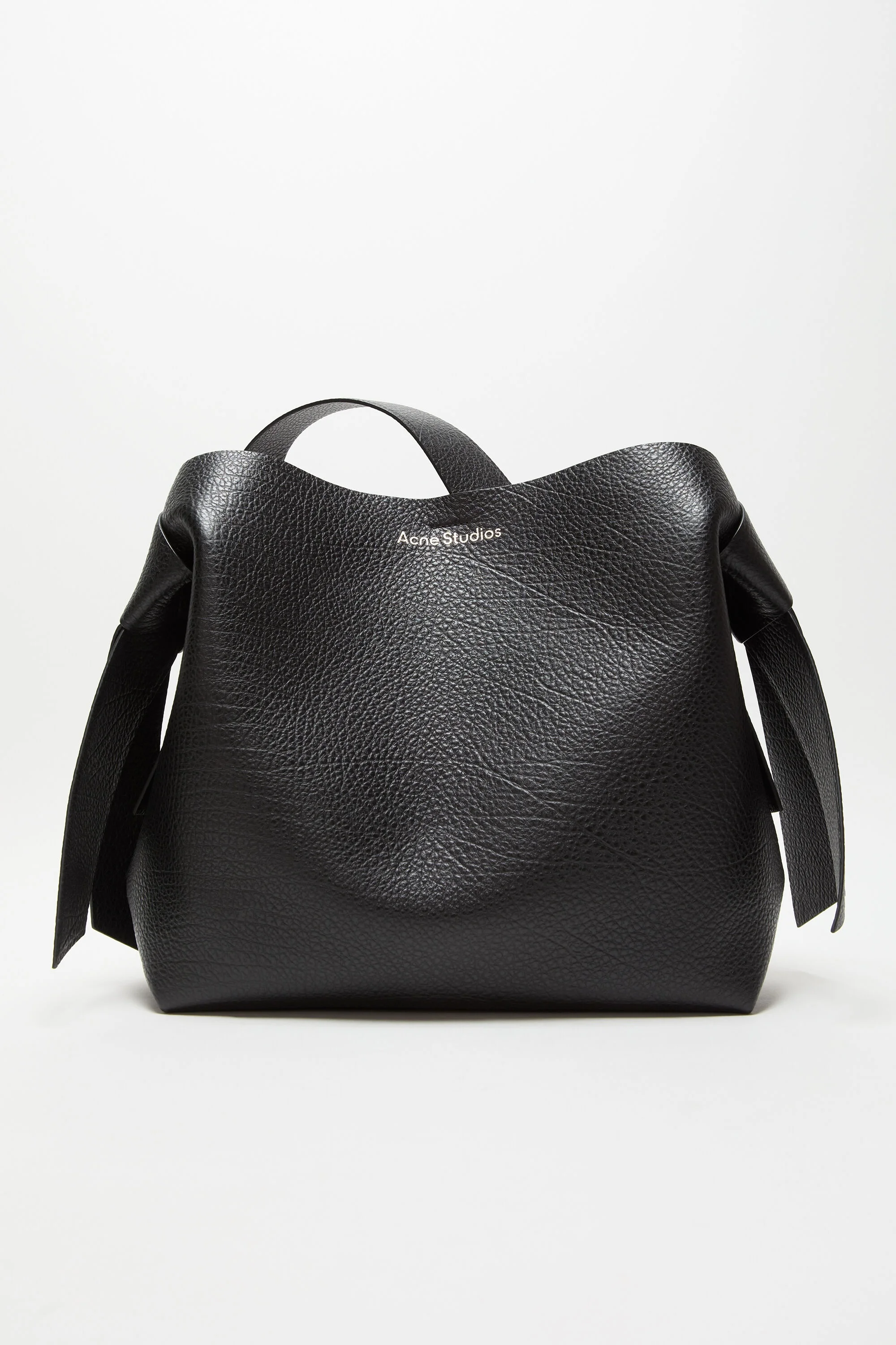 Midi shoulder bag is adorned with twisted musubi knots on each side, inspired by traditional Japanese obi sashes. Crafted from grainy calf leather, detailed with an embossed Acne Studios logo. Completed with a middle zippered pocket compartment and a discrete magnetic closure. - Grainy leather - Side knot detail - Shoulder strap - Interior zipper compartment pocket with branded lanyard - Gold-tone finishes - Embossed Acne Studios logo - Measurements: 35 cm; 35 cm; 16 cm - Strap measurement: 130 cm full length - Protectve dustbag included - Made in Italy - Style ID: FN-WN-BAGS000508 - Shell: 100% Calf leather, Lining: 100% Lamb leather