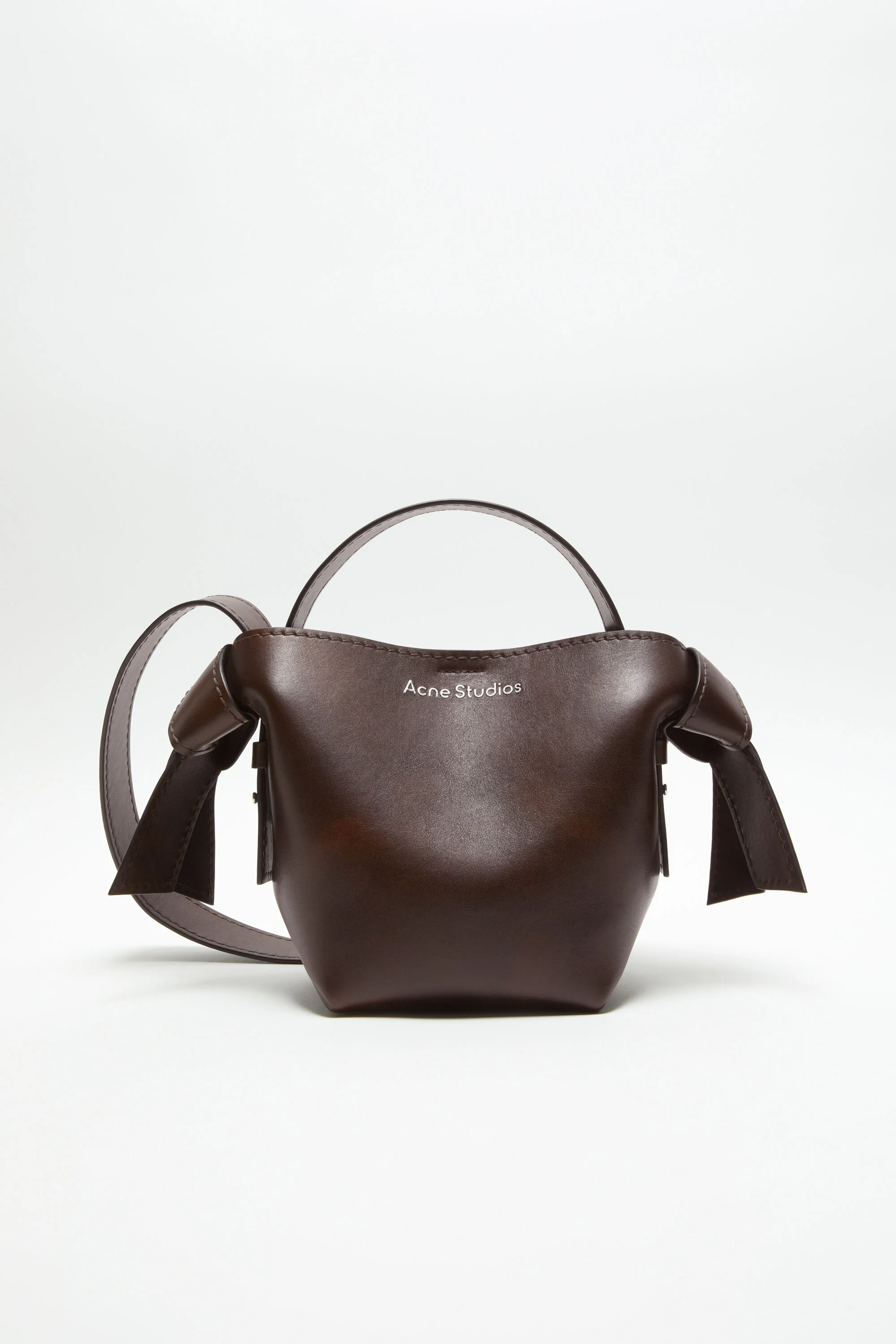 Mini shoulder bag is adorned with twisted musubi knots on each side, inspired by traditional Japanese obi sashes. Crafted from tanned leather with a mixed brown finish and detailed with an embossed Acne Studios logo. - Musubi knot - Debossed logo - Top handle - Detachable shoulder strap - Interior compartment - Snap button closure - Protective dustbag included - Made in Italy - Measurements: 21,5 cm; 20,5 cm; 15,5 cm - Strap measurements: 130 cm full length - Style ID: FN-WN-BAGS000453 - Shell: 100% Calf leather, Lining: 100% Lamb leather