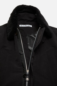 Jacket crafted from rich nylon with a vintage-inspired peached finish, featuring a shearling collar. Designed with a front zip and button closure, waist welt pockets, side seam pockets, ribbed cuffs, and a leather logo patch at the back neckline. Cut to a relaxed fit with relaxed sleeves and hip length. - Relaxed fit - Hip length - Relaxed sleeves - Shearling collar - Leather logo patch - Front zip and button closure - Waist welt pockets - Side seam pockets - Ribbed cuffs - Fully lined - Model is 189 cm / 6'2 and wears a size 46 - Style ID: FN-MN-OUTW001203 - Shell: 100% Nylon, Collar: 100% Lamb shearling, Lining: 100% Polyester, Filling: 100% Polyester