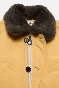 Jacket crafted from rich nylon with a vintage-inspired peached finish, featuring a shearling collar. Designed with a front zip and button closure, waist welt pockets, side seam pockets, ribbed cuffs, and a leather logo patch at the back neckline. Cut to a relaxed fit with relaxed sleeves and hip length. - Relaxed fit - Hip length - Relaxed sleeves - Shearling collar - Leather logo patch - Front zip and button closure - Waist welt pockets - Side seam pockets - Ribbed cuffs - Fully lined - Model is 189 cm / 6'2 and wears a size 46 - Style ID: FN-MN-OUTW001203 - Shell: 100% Nylon, Collar: 100% Lamb shearling, Lining: 100% Polyester, Filling: 100% Polyester