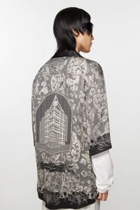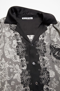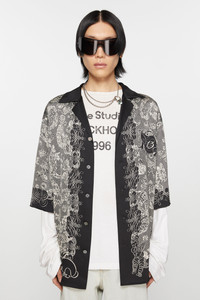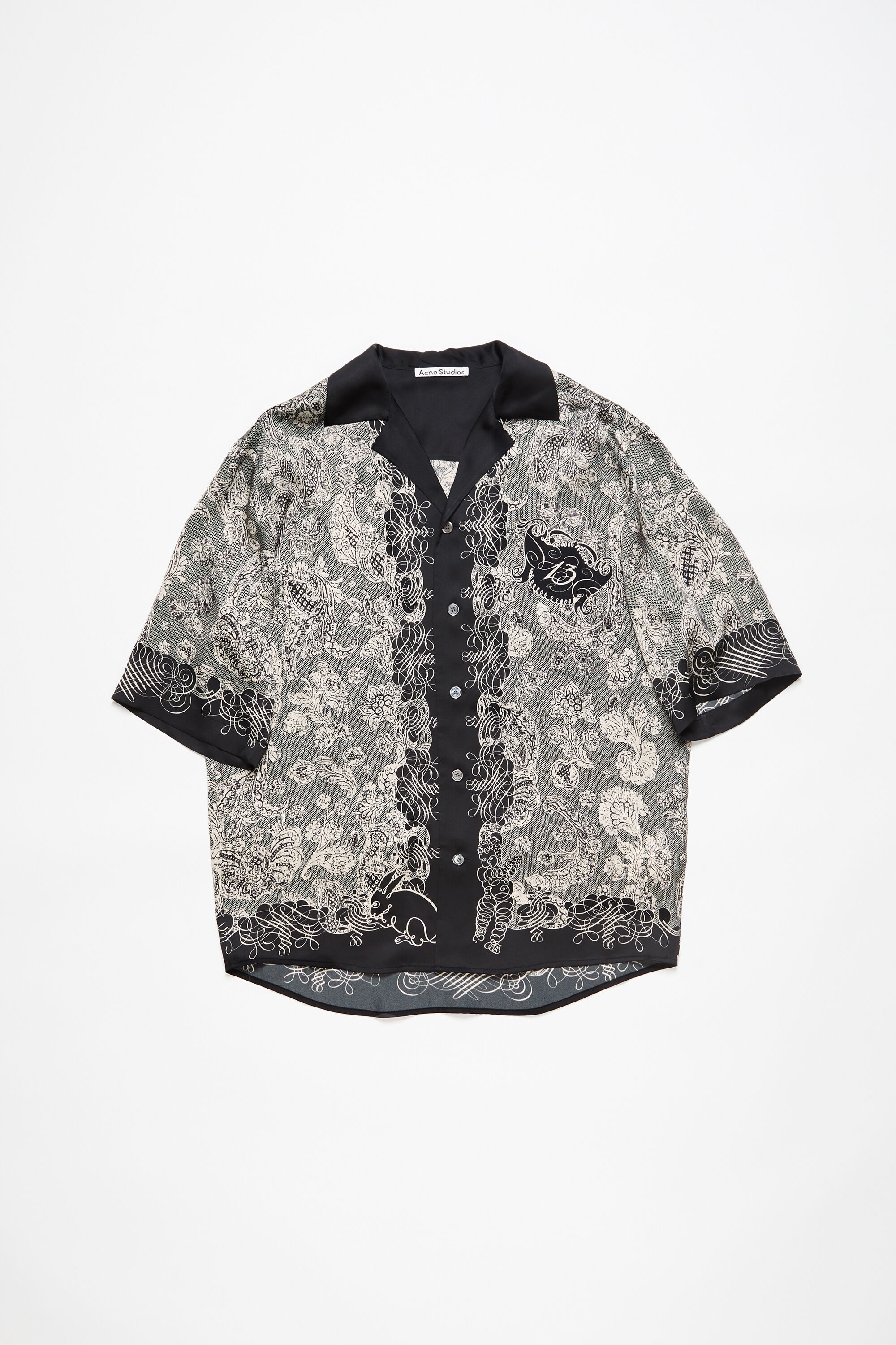Short sleeve button-up shirt is cut to a relaxed fit and below hip length. Detailed with an all-over seasonal print, crafted from fluid satin. - Relaxed fit - Below hip length - Short sleeve - Print - Button-up closure - Model is 182 cm / 6′1 and wears a size 46 - Style ID: FN-MN-SHIR000772 - Shell: 100% Viscose