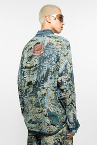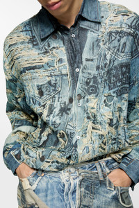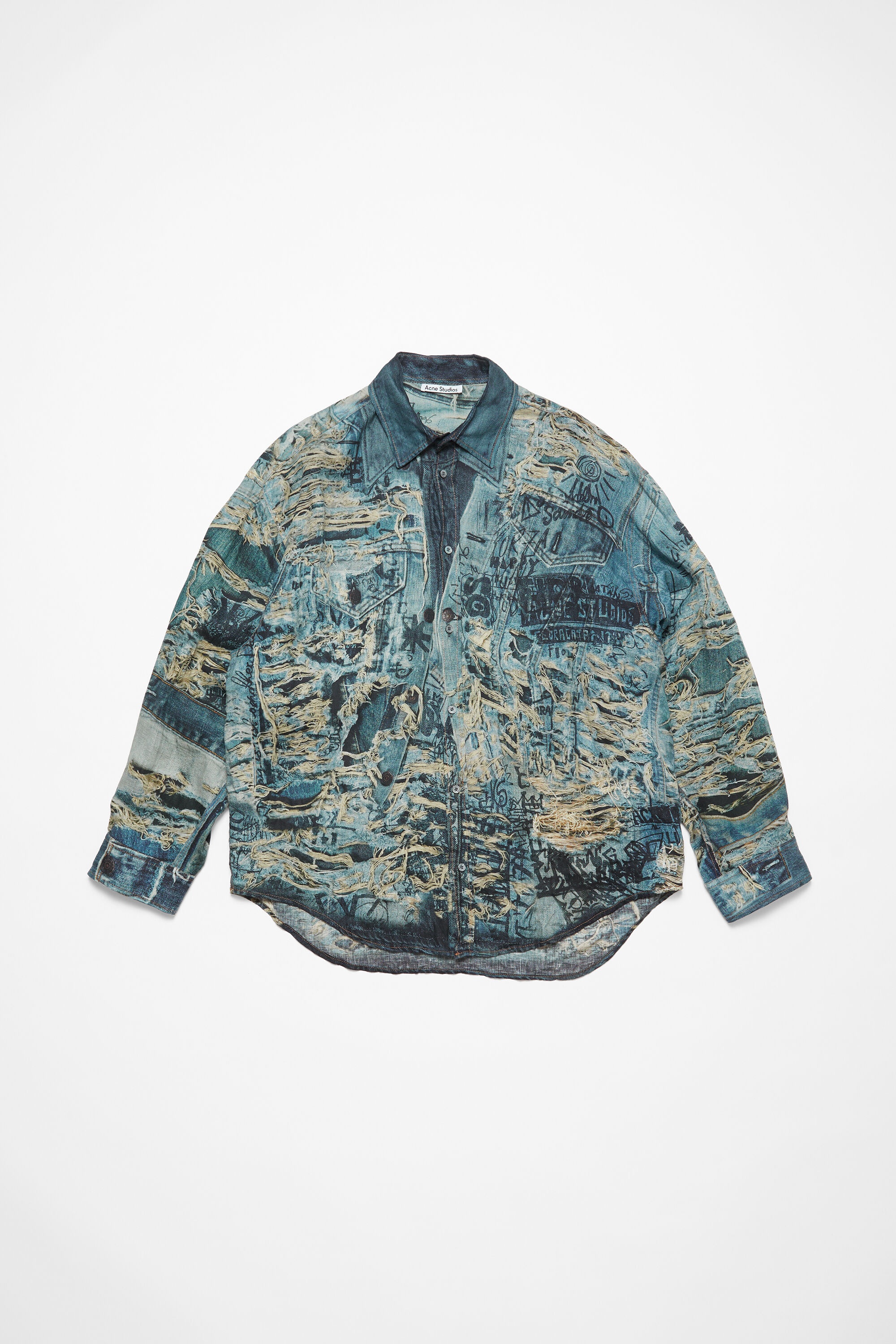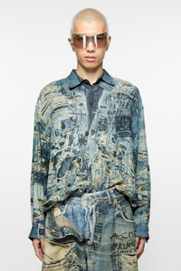 Button-up shirt is crafted in lightweight linen, adorned with a seasonal trompe l'oeil distressed denim print and logo. Cut to a relaxed fit and below hip length. - Relaxed fit - Below hip length - Trompe l'oeil distressed denim print - Logo at the back - Button-up closure - Model is 183cm/ 6' and wears a size 46 - Style ID: FN-MN-SHIR000872 - Shell: 100% Linen