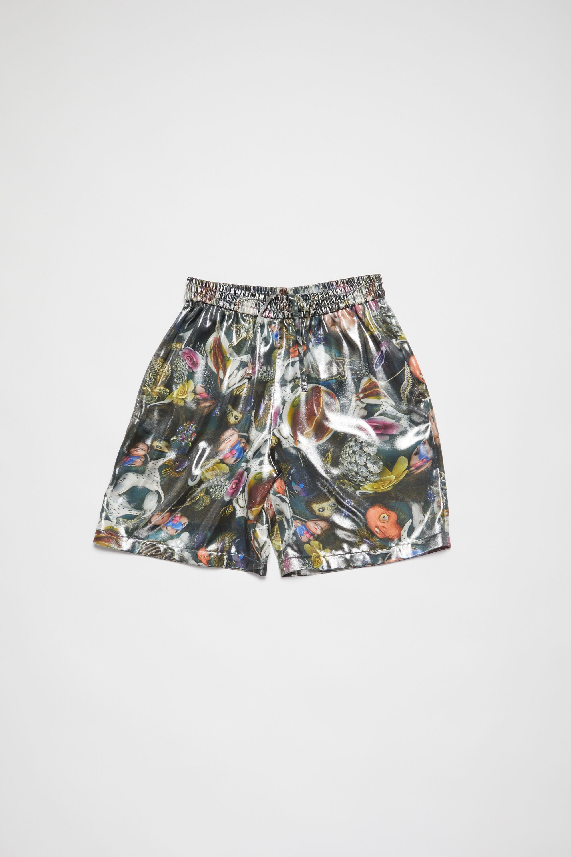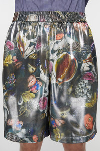 Casual shorts are cut a relaxed fit with a mid waist, wide leg and short length. Adorned with an all-over print in collaboration with artist Per Sundberg. Crafted from a fluid drape fabric with a foiled and glassy finish. - Relaxed fit - Mid waist - Wide leg - Short length - Elasticated waistband functional drawstrings - In collaboration with artist Per B Sundberg - All over print - Side and back pockets - Model is 186 cm / 6′2 and wears a size 46 - Style ID: FN-MN-SHOR000217 - Shell: 100% Polyester