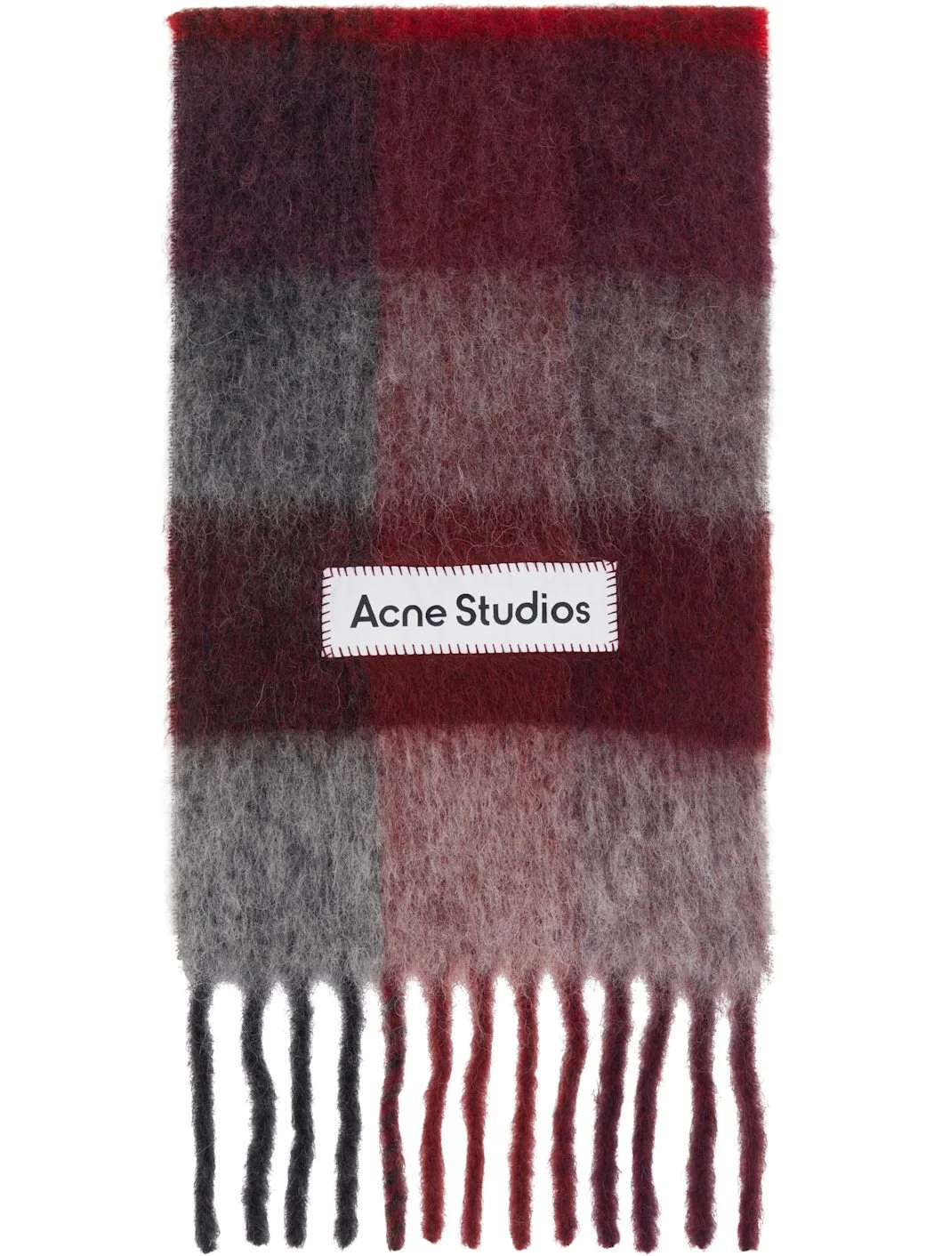 Rectangular brushed alpaca- and wool-blend flannel scarf. · Jacquard check pattern throughout · Logo patch at face · Fringed detailing at ends · L98" x W11" Supplier color: Red/Black 33% alpaca, 25% wool, 22% nylon, 20% mohair. Made in Italy 252129M150024