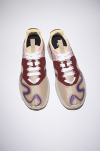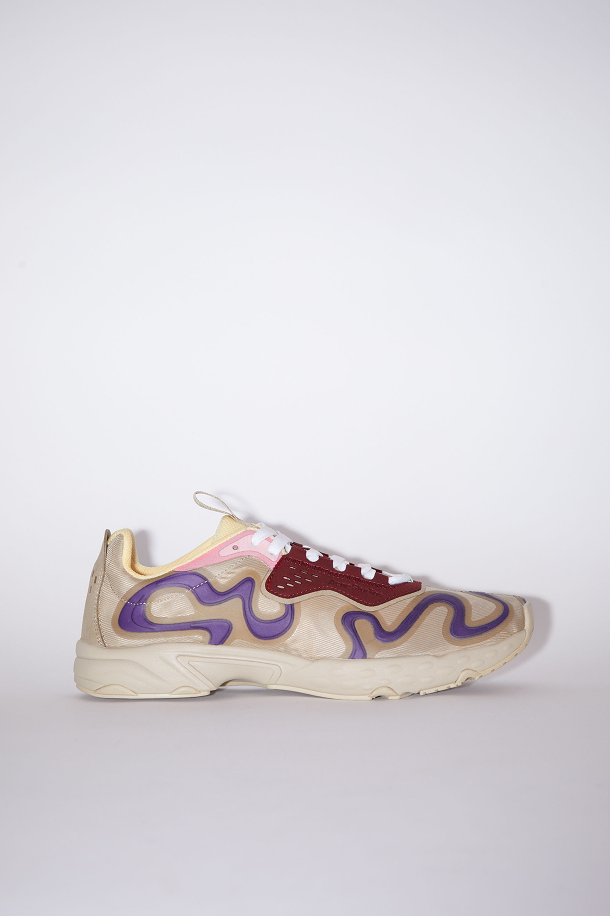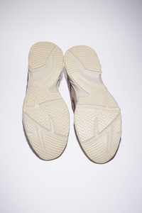 Acne Studios multi beige lace-up sneakers feature a ribbon logo pattern and an Acne Studios logo. Complete with a recycled rubber sole. - Lace-up - Acne Studios ribbon logo - Transparent nylon twill upper - Recycled rubber sole - Style ID: N3W Tokai M - Uppers: 51% Nylon, 31% Thermoplastic polyurethane, 18% Polyurethane, Lining: 100% Polyester, Soles: 100% Polyurethane, Soles: 100% Rubber