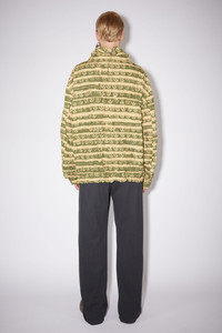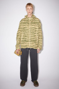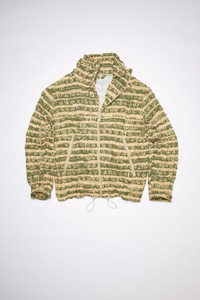 Acne Studios peach/khaki green casual jacket is made of crinkled, lightweight ripstop polyester with a water repellent finish. Cut to a relaxed silhouette, it is detailed with all-over peace symbols. Details: - Drawstring collar and hem - Centre front zipper closure - Two front zippered pockets - Sleeve tabs with velcro - Unlined - Style ID: FN-MN-OUTW000776 - Main material: 100% polyester Sizing: - Relaxed fit - European sizing - Model is 187cm/ 6'1" and wears a size 46