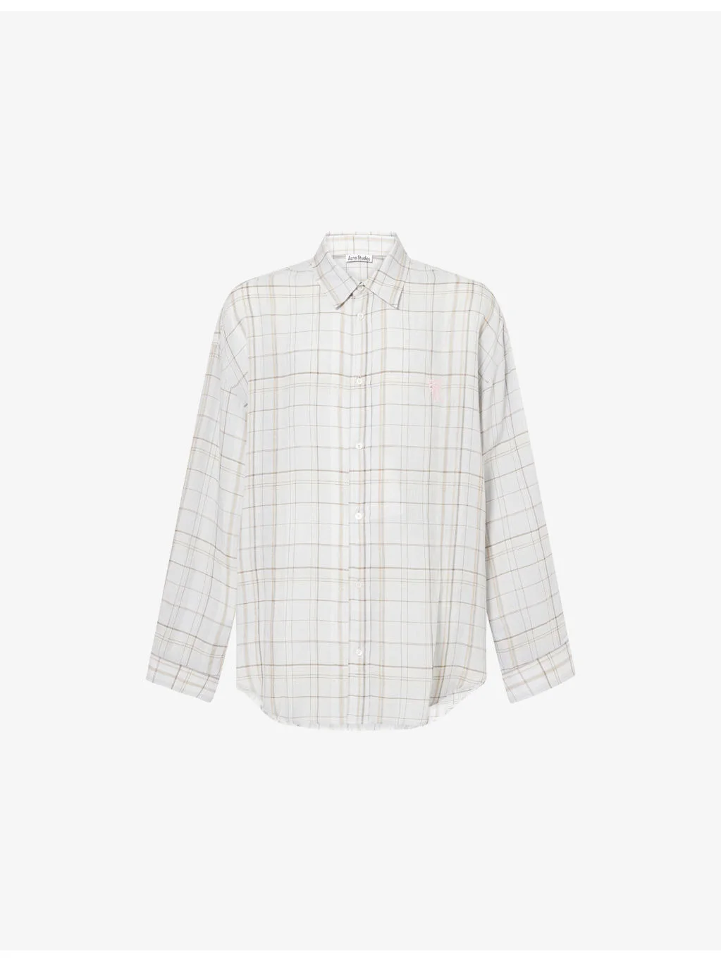 PRODUCT DETAILS - Acne Studios woven shirt - 69% viscose, 29% linen, 1% polyester, 1% nylon - Exposed button fastening at front - Spread collar - Buttoned cuffs - Relaxed fit, collar, long sleeves, brand and bow embroidery at front, straight yoke at back, all-over check print, all-over metallic wave, curved hem - Dry clean only - Made in Portugal - Size UK 40: length 31in / 80cm, chest 54in / 137cm - Model is 6ft 2in/1.88m and wears a size UK 40 - Lightweight, stretchy Ref: R04580893