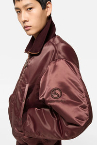 Bomber jacket crafted from technical fabric with a high-shine finish. Features a high ribbed collar and seasonal embroidered logo on the sleeve. Designed with welt pockets with snap closure, ribbed cuffs and hem, and a two-way front zip closure. Cut to a regular fit and below-waist length. - Regular fit - Below-waist length - High ribbed collar - Embroidered logo - Welt pockets - Ribbed cuffs and hem - Two-way front zip closure - Model is 189 cm / 6'2 and wears a size 46 - Style ID: FN-MN-OUTW001185 - Shell: 100% Nylon, Lining: 100% Polyester, Filling: 100% Polyester