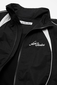 Technical jacket crafted from a cotton blend with a soft, peached finish, designed for a sporty look. Features embroidered seasonal artwork on the front and back, a high collar, and striped piping details. Completed with a two-way front zip, side-seam pockets, and elasticated cuffs. Cut to a relaxed fit and hip length. - Relaxed fit - Hip length - Embroidered seasonal artwork on front and back - High collar - Piping and striped details - Two-way front zip closure - Side-seam pockets - Elasticated cuffs - Model is 188 cm / 6'2 and wears a 46 - Style ID: FN-MN-OUTW001287 - Made with organically grown cotton and recycled polyester. - Shell: 47% Cotton, 37% Polyester, 16% Nylon, Lining: 85% Nylon, 15% Elastane