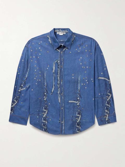 Acne Studios' 'Setar' trompe l'oeil shirt is printed to look like denim, complete with stud embellishments and laces, though in reality, it's made from crepe de chine. Style yours with genuine jeans or the brand's shorts in the same effect. Size & Fit - Fits true to size. Take your normal size - Designed for a loose fit - Lightweight, non-stretchy fabric - Model is shown wearing an IT 48 - Model measures: chest 38"/ 96cm, height 6'2"/ 188cm Details & Care - Multicoloured crepe de chine - Button fastenings - 100% viscose - Dry clean - Shell: Indonesia
