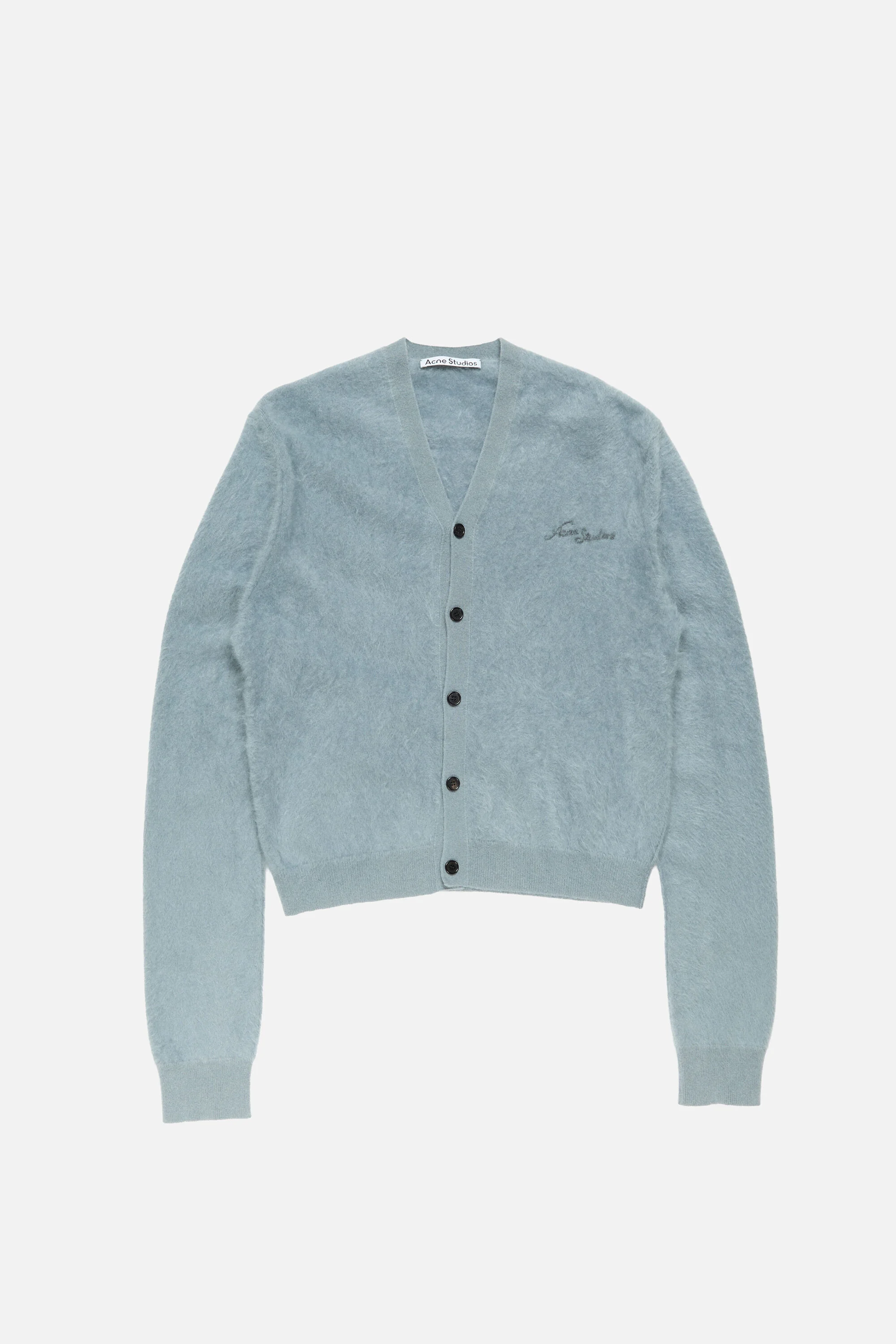 V-neck button-up cardigan crafted from soft cashmere with a brushed finish for a furry texture, featuring embroidered seasonal Acne Studios logo on the chest. Complete with ribbed trim and cut to a regular fit. - Button-up cardigan - Regular fit - V-neckline - Embroidered logo - Ribbed trim - Model is 188 cm / 6'1 and wears a size S - Style ID: FN-MN-KNIT000625 - Shell: 100% Cashmere