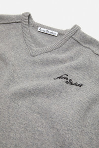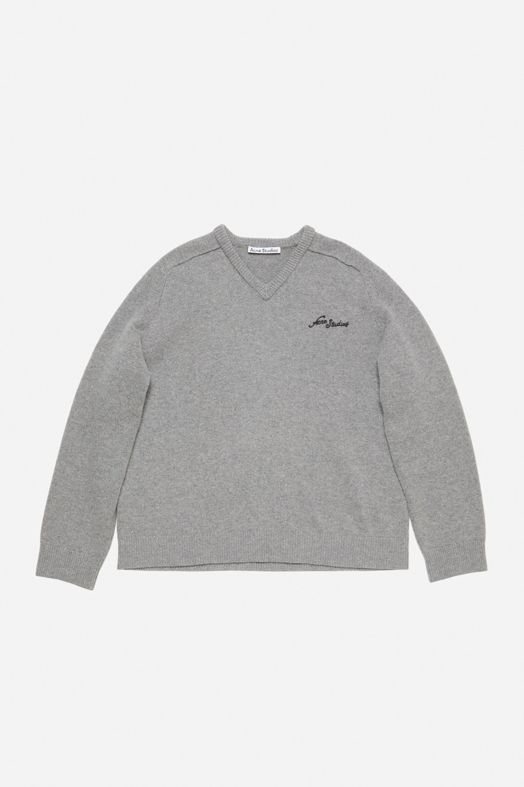 V-neck sweater crafted from carefully selected, high-quality yak yarn. Features an embroidered Acne Studios logo on the chest and ribbed neckline, cuffs, and hem. Cut to a regular fit with a below-hip length. Due to the natural characteristics of the fiber, each garment has a unique shade and may vary in color. Handle with care to preserve its original look as long as possible. - Regular fit - Below-hip length - V-neckline - Embroidered logo - Ribbed neckline, cuffs, and hem - Model is 187 cm / 6'1 and wears a size M - Style ID: FN-MN-KNIT000577 - Certified to the Responsible Wool Standard (RWS) by Control Union, license number CU-1024001 - Shell: 50% Yak wool, 50% Wool