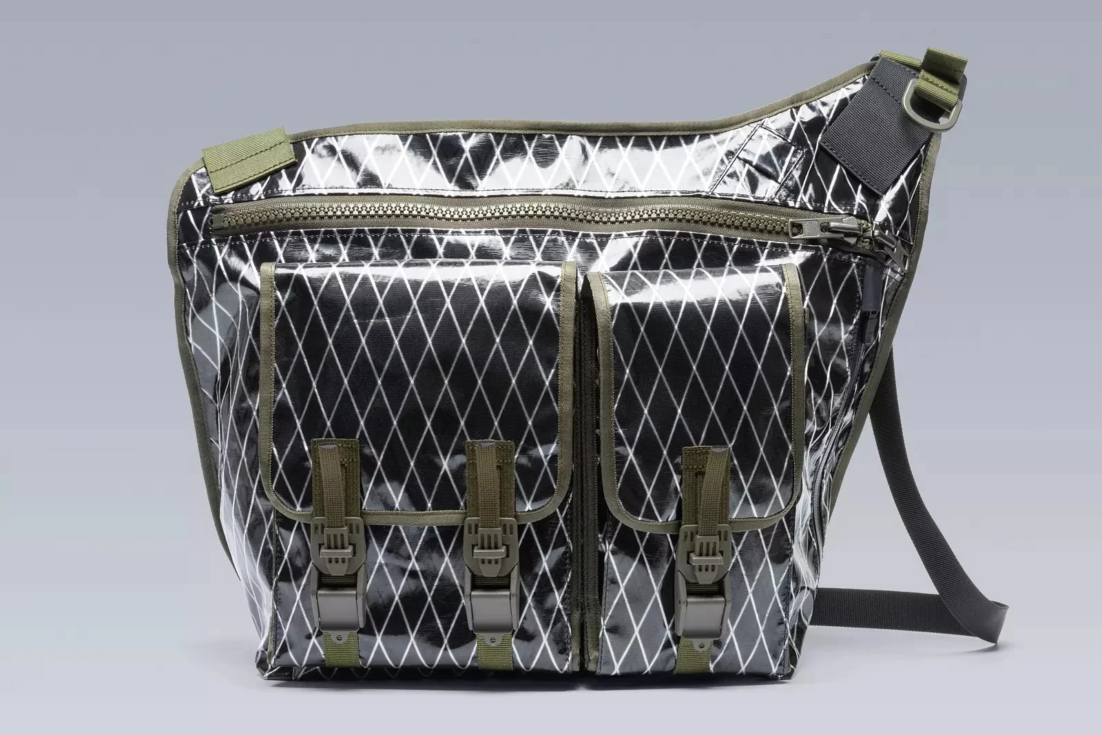 The original ACRONYM 3RD ARM INTEROPSǽ bag. Asymmetrical dynamical hybrid system. German military hardware. Ergonomic patterns. Kinaesthetic intent. Cadence, speed, and practicality in a use-driven adaptive load bearing system. Based on technology derived from competition sailcloth, the FOIL F3 composite fabric delivers an exceptional use to weight ratio and a broken by design visual signature. The outer face of the fabric will crease and deform over time, creating irregularities that are intrinsic to the fabric. Surface deformation will vary with type and style of use. Fabric technology X-Pac® (78% PA, 22% PES) Fabric made in USA Sizing FORMAT: A4 _ [ + 27 × 42 cm ] Weight: 581g (Including removable parts) Systems ACRONYM INTEROPSǽ (PAT.) ACRONYM SOUNDǽ (PAT.) Subsystems Line I/Oǽ [ Gates: 3 ] QLQRǽ Strap Assembly _25-50 mm shoulder strap [ Removable ] _QLQR unit Pockets: 8 _External: 5 [ Mezzanine: 2 ] _Internal: 3 Includes 25-50 mm shoulder strap [ Removable ] Interface with All ACRONYM INTEROPSǽ jackets Actual product may differ from images.