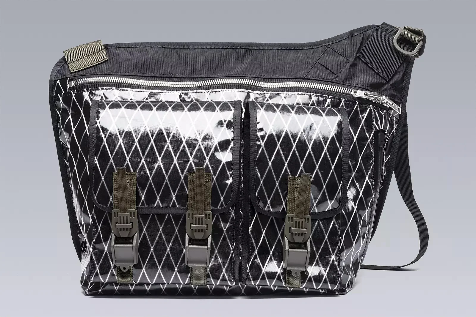 The original ACRONYM 3RD ARM INTEROPSǽ bag. Asymmetrical dynamical hybrid system. German military hardware. Ergonomic patterns. Kinaesthetic intent. Cadence, speed, and practicality in a use-driven adaptive load bearing system. Based on technology derived from competition sailcloth, the FOIL F3 composite fabric delivers an exceptional use to weight ratio and a broken by design visual signature. The outer face of the fabric will crease and deform over time, creating irregularities that are intrinsic to the fabric. Surface deformation will vary with type and style of use. Fabric technology X-Pac® (78% PA, 22% PES) Fabric made in USA Sizing FORMAT: A4 _ [ + 27 × 42 cm ] Weight: 626g (Including removable parts) Systems ACRONYM INTEROPSǽ (PAT.) ACRONYM SOUNDǽ (PAT.) Subsystems ACRONYM INTEROPSǽ (PAT.) ACRONYM SOUNDǽ (PAT.) Includes 25-50 mm shoulder strap [ Removable ] Interface with All ACRONYM INTEROPSǽ jackets Actual product may differ from images.