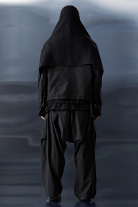 A silhouette redefining accessory, CA1-AK is part hood, part scarf, part cape. Knit in baby llama wool with a beanie style head piece and a geometric decorative pattern throughout. Diagonal slashes function as shoulder articulation points. Can be worn inside/under jackets with large collars and hoods, or outside/over jackets with short/no collars, or hoods removed. Fabric technology BABY LLAMA WOOL finest quality (100% Wool) LlamaSoft® dehairing technology Made in Bolivia BABY LAMA WOLLE Feinste Qualitat (100% Wolle) LlamaSoft® Enthaarungstechnologie In Bolivien hergestellt Sizing One size FORMAT: _ [ 148 × 57 cm ] Weight: 417 g Actual product may differ from images. Price including VAT and excluding shipping costs.