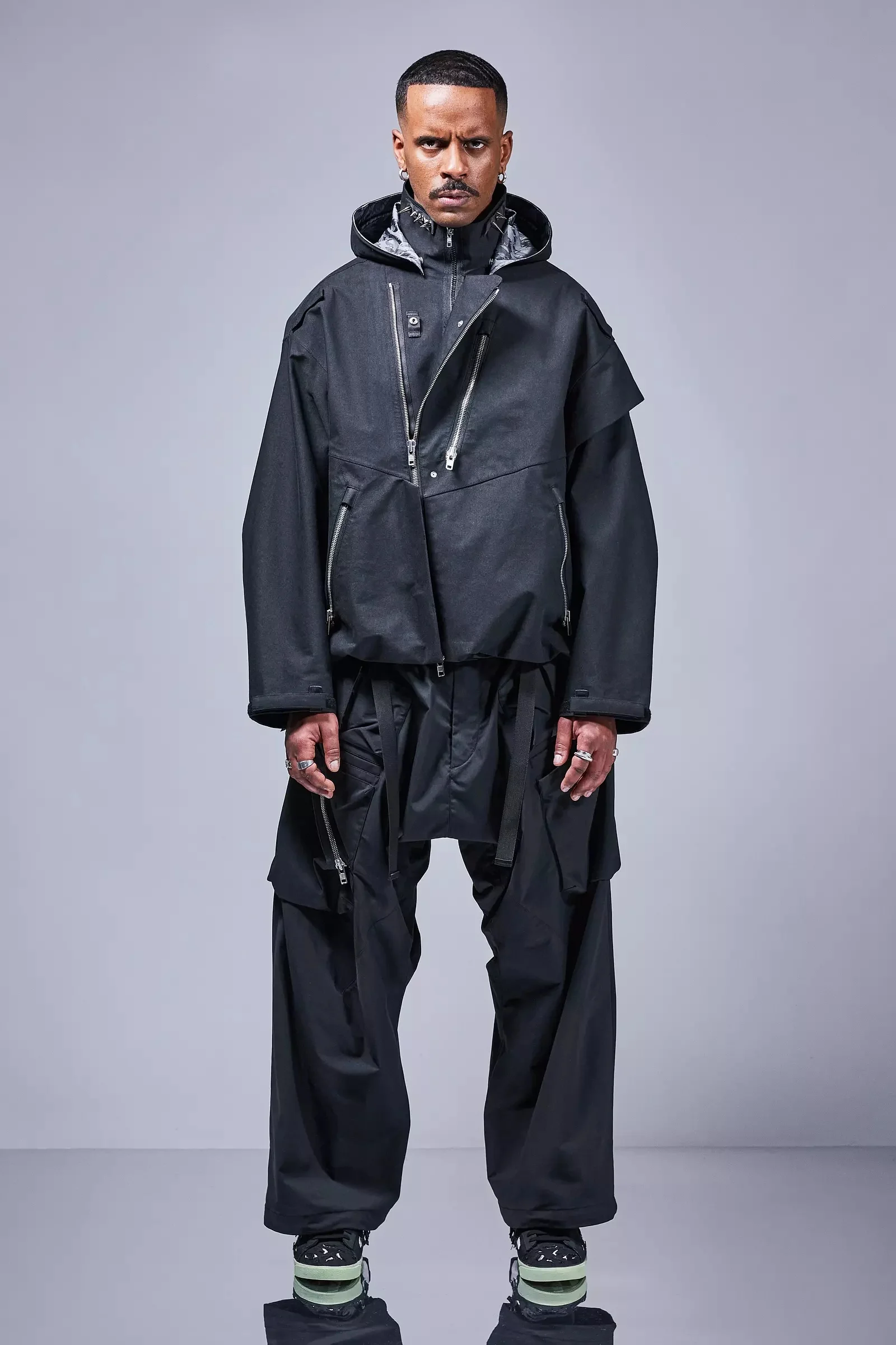 The rider jacket redesigned from the ground up and available for the first time in a widebody fit. The J68W fit block is built around a precisely engineered gusset and sleeve. This allows for superior range of motion, even without the traditional (often leak enabling) action back pleat. The centre front storm flaps were also re-thought and are set up to provide a plethora of wearing options. This includes the unorthodox secondary collar zip which allows for complete closure when fastened. Detached entry lower pockets deliver high-volume storage both fore and rearward of their zip openings. ForceLockǽ, JacketSlingǽ, and ACRONYM standard above-standard build complete the reset. Built in an all new custom developed 3L fabric with a cotton face and Zebra print backer and seam tape. Combining the best attributes of natural and technical materials, this fabric breaks in beautifully, softening and patinating over time. [ Shown in size: M. Fits: WIDE ] Fabric technology 3L TECHNICAL COTTON _Fabric: 68% CO, 32% PES _Backer: 100% PES [ REC ] _Waterproof, windproof, breathable _PFC and solvent free technology _Taped seams _Zebra print backer and seam tape 3L TECHNISCHE BAUMWOLLE _(Oberstoff: 68% Cotton, 32% Polyester, Membran: Polyolefin basiert, Innenfutter: 100% Polyamid ( Recycled ) ) _Wasserdicht, winddicht, atmungsaktiv _PFC und Losungsmittelfreie Technologie _Verschweißte Nahte _Zebraprint bedrucktes Innenfutter und Nahtband Sizing Size XS S M L XL 1/2 Chest 62 65 68 71 74 Length 64.5 67.5 70.5 73.5 76.5 Shoulders 18.5 20.5 22.5 23 23.5 Sleeves 54 57 60 63 66 All measurements in centimeters. Weight: 1096g (size M, including removable parts) Systems ACRONYM SOUNDǽ (PAT.) Subsystems ForceLockǽ JacketSlingǽ SpeedLockǽ TensionZipaé AuxZipǽ ( F ) Pockets: 3 _External: 3 _Internal: 0 Includes ForceLockǽ [ Removable ] JacketSlingǽ [ Removable ] Storm Hood [ Removable ] Logo spike tape [ Removable ] Interface with All ACRONYM AuxZipǽ ( M ) units Actual product may differ from images. Price including VAT and excluding shipping costs.
