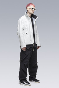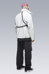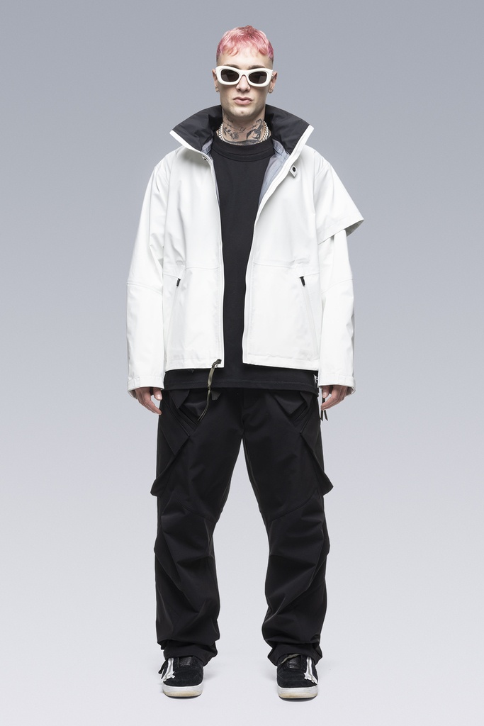 The new funk brutalism. Compact and comprehensive, J101 makes no bones and brooks no compromise. Stopless. Direct. Asymmetric. Jacketslingǽ for portability. AuxZipǽ for modularity. EscapeZipǽ for rapidity. Interopsǽ for variablility. 3L GORE-TEX® Pro** for extremity. [ **Built with enhanced Gore-Tex® Pro most breathable technology to provide extreme breathability—minimizing moisture buildup to give more comfort in more conditions—with retained ruggedness, uncompromised waterproof and windproof protection, and superior lightweight qualities with an improved environmental footprint. ] [ **Optimized for breathability during higher-intensity activities, while retaining the ruggedness and waterproof ratings for which Gore-Tex® Pro is known. This technology newly introduces the lightest laminates ever offered in the Gore-Tex® Pro category, using 30-denier face textiles and the new solution-dyed version of the robust Micro Grid™ backer. ] [ Shown in size: M. Fits: STRAIGHT ] Fabric technology 3L GORE-TEX® PRO [ Most breathable technology ] (72% PA, 28% ePTFE) With solution-dyed Micro Grid™ backer for improved environmental footprint GUARANTEED TO KEEP YOU DRY™ Sizing Size XS S M L XL 1/2 Chest 59 62 65 68 71 Length 63 66 69 72 75 Shoulders 16 16.5 17 17.5 18 Sleeves 60,5 62,5 64,5 66,5 68,5 All measurements in centimeters. Weight: 590g (size M, color: Black, including removable parts) Systems ACRONYM INTEROPSǽ (PAT.) ACRONYM SOUNDǽ (PAT.) Subsystems ForceLockǽ JacketSlingǽ EscapeZipǽ SpeedLockǽ AuxZipǽ ( M ) Pockets: 2 _External: 2 _Internal: 0 Includes ForceLockǽ [ Removable ] JacketSlingǽ [ Removable ] Logo tape [ Removable ] Interface with All ACRONYM AuxZipǽ ( M ) units Actual product may differ from images.