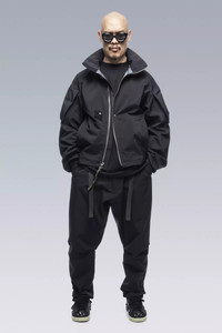 As we live through the collapse of reliable narratives, the ability to remain dynamic and autonomous is increasingly coveted. J110TS-GT strips out useful aspects of military industrial typologies and places them at your service in a format free of preconceived references. J110’s oversize shape and variable stage center front closure accommodates myriad body types and layers. Detached entry shoulder pockets and bilateral front pockets provide ample storage. The side elevation of the jacket reveals double rows of Tec Sys webbing for customisation. The back of the jacket features a perforated retroreflective skirt with a high-gloss logo application. Sleeve cuffs and rear hem are in Gore-Tex dimensional flex laminate. The jacket itself is fully taped 3-layer Gore-Tex Pro and Guaranteed to Keep You Dry™. Built with enhanced Gore-Tex® Pro most breathable technology** to provide extreme breathability—minimizing moisture buildup to give more comfort in more conditions—with retained ruggedness, uncompromised waterproof and windproof protection, and superior lightweight qualities with an improved environmental footprint. [ **Optimized for breathability during higher-intensity activities, while retaining the ruggedness and waterproof ratings for which Gore-Tex® Pro is known. This technology newly introduces the lightest laminates ever offered in the Gore-Tex® Pro category, using 30-denier face textiles and the new solution-dyed version of the robust Micro Grid™ backer. ] [ Shown in size: M. Fits: WIDE ] Fabric technology 3L GORE-TEX® PRO [Most breathable technology] _(72% PA, 28% ePTFE) _With solution-dyed Micro Grid™ backer for improved environmental footprint _GUARANTEED TO KEEP YOU DRY™ Sizing Size XS S M L XL 1/2 Chest 71 74 77 80 83 Length 67.5 69.5 71.5 73.5 75.5 Shoulders 22 22,5 23 23.5 24 Sleeves 67,5 69,5 71.3 73,5 75,5 All measurements in centimeters. Weight: 769g (size M, color: Black, including removable parts) Systems ACRONYM SOUNDǽ (PAT.) ACRONYM TEC SYS TEC SYS GRID: Rows: 2 Channels: 4 Subsystems ForceLockǽ JacketSlingǽ SpeedLockǽ AuxZipǽ ( F ) Pockets: 4 _External: 4 _Internal: 0 Includes ForceLockǽ [ Removable ] Logo tape [ Removable ] JacketSlingǽ [ Removable ] Actual product may differ from images.