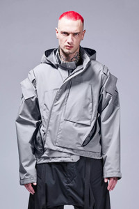 GT-J14 is the new black (even when it’s gray). A GORE-TEX® Performance Technology tactical jacket in abrasion resistant 3-layer fabric. 5 MM WR TensionZipǽ lower pockets with hidden internal handwarmers in bonded retro-reflective fleece. Breakaway EscapeZipǽ centre front. Shapeshifting boxy-NBC to asymmetric-V silhouette via taper zip. Interopsǽ functionality. AuxZipǽ modularity. ForceLockǽ. Black ops. Black bag. Black diamond. Goddo supiido yuu! Burakku emparaa. [ Shown in size: M. Fits: STRAIGHT ] Fabric technology 3L GORE-TEX® PRODUCTS WITH PERFORMANCE TECHNOLOGY _Shell: 100% PA6 [REC] _Backer: 100% ePE _Solution dyed _GUARANTEED TO KEEP YOU DRY™ 3L GORE-TEX® PRODUCTS WITH PERFORMANCE TECHNOLOGY _Oberstoff: 100% Polyamid _Membran: expandiertes Polyethylen: 100% Polyamid _Mit spinnfasergefarbten Rundstrick Innenfutter _GUARANTEED TO KEEP YOU DRY™ Sizing Size XS S M L XL 1/2 Chest 63 66 69 72 75 Length 61 64 67 70 73 Shoulders 17 17.5 18 18.5 19 Sleeves 61.5 64.5 67.5 70.5 73.5 All measurements in centimeters. Weight: 712g (size M, including removable parts) Systems ACRONYM INTEROPSǽ (PAT.) ACRONYM SOUNDǽ (PAT.) Subsystems ForceLockǽ JacketSlingǽ EscapeZipǽ SpeedLockǽ TensionZipaé AuxZipǽ ( F ) Pockets: 10 _External: 8 _Internal: 2 Includes ForceLockǽ [ Removable ] JacketSlingǽ [ Removable ] Storm Hood [ Removable ] Logo tape [ Removable ] Interface with All ACRONYM INTEROPSaé bags All ACRONYM AuxZipǽ ( M ) units Actual product may differ from images. Price including VAT and excluding shipping costs.