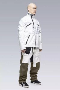 The very idea of ACRONYM rendered in physical, wearable form. A carefully balanced array of functional and aesthetic systems presented here in completely remastered form, and, for the first time, with TEC SYS webbing. Asymmetric. Dynamic. Modular. ACRONYM among equals. Combine with 3A-1, 3A-2, or 3A-3TS for full INTEROPSǽ functionality. Built with enhanced Gore-Tex® Pro most breathable technology** to provide extreme breathability—minimizing moisture buildup to give more comfort in more conditions—with retained ruggedness, uncompromised waterproof and windproof protection, and superior lightweight qualities with an improved environmental footprint. [ **Optimized for breathability during higher-intensity activities, while retaining the ruggedness and waterproof ratings for which Gore-Tex® Pro is known. This technology newly introduces the lightest laminates ever offered in the Gore-Tex® Pro category, using 30-denier face textiles and the new solution-dyed version of the robust Micro Grid™ backer. ] [ Shown in size: M. Fits: WIDE ] Fabric technology 3L GORE-TEX® PRO [Most breathable technology] (72% PA, 28% ePTFE) With solution-dyed Micro Grid™ backer for improved environmental footprint GUARANTEED TO KEEP YOU DRY™ Sizing Size XS S M L XL 1/2 Chest 62,5 65,5 68,5 71,5 74,5 Length 70 72 74 76 78 Shoulders 15 15,5 16 16,5 17 Sleeves 65,5 67,5 69,5 71,5 73,5 All measurements in centimeters. Weight: 880g (size M, color: Black, including removable parts) Systems ACRONYM INTEROPSǽ (PAT.) ACRONYM SOUNDǽ (PAT.) ACRONYM TEC SYS TEC SYS GRID: Rows: 4 Channels: 10 Subsystems ForceLockǽ JacketSlingǽ EscapeZipǽ SpeedLockǽ Gravity Pocketǽ AuxZipǽ ( F ) Pockets: 9 _External: 9 _Internal: 0 Includes ForceLockǽ [ Removable ] JacketSlingǽ [ Removable ] Storm Hood [ Removable ] Logo tape [ Removable ] Interface with All ACRONYM INTEROPSǽ bags All ACRONYM 3RD ARM Modular [ M ] pockets All ACRONYM AuxZipǽ ( M ) units Actual product may differ from images.