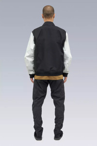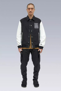No school as school. No team as team. J94 is only the second time Acronym has interpreted the varsity jacket and this time the visual cues are all that remain. On a technical level, this is on another level. 3-layer composite body and sleeve fabrics means the jacket weighs in at just over 500 grams. Fully taped construction means wind and water invulnerability and true all season use. Dimensional flex laminate hem and cuffs mean the slickest possible care-free closures are also breathable and waterproof. 2 stage centre front closure means one hand and snap for convenience, or 2 hands and zip for a complete weather seal. Jacketsling means you can stop thinking about it when you stop wearing it. Chenille 'Wildcard' graphic on left chest (no letter as letter) and 'delta-Ǎ' embroidery on cuff. Pair with FC3-GT for complete wet weather protection. [ Shown in size: M. Fits: STRAIGHT ] Fabric technology 3L Technical Wool (Body) (41% PES, 36% CLY, 23% WO) 3L Nylon (Sleeves) (70% PA, 30% ePTFE) Sizing Size XS S M L XL 1/2 Chest 56 59 62 65 68 Length 65 68 71 74 77 Shoulders 17 17.5 18 18.5 19 Sleeves 65 67 69 71 73 All measurments in centimeters. Weight: 520g (size M, color: Black, including removable parts) Systems ACRONYM SOUNDǽ (PAT.) Subsystems JacketSlingǽ AuxZipǽ ( F ) Pockets: 2 _External: 2 _Internal: 0 Includes ForceLockǽ [ Removable ] JacketSlingǽ [ Removable ] Logo tape [ Removable ] Interface with All ACRONYM AuxZipǽ ( M ) units Actual product may differ from images.