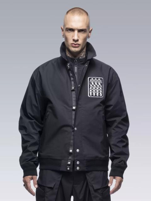 No school as school. No team as team. J94 is only the second time Acronym has interpreted the varsity jacket and this time the visual cues are all that remain. On a technical level, this is on another level. 3-layer composite body and sleeve fabrics means the jacket weighs in at just over 500 grams. Fully taped construction means wind and water invulnerability and true all season use. Dimensional flex laminate hem and cuffs mean the slickest possible care-free closures are also breathable and waterproof. 2 stage centre front closure means one hand and snap for convenience, or 2 hands and zip for a complete weather seal. Jacketsling means you can stop thinking about it when you stop wearing it. Chenille 'Wildcard' graphic on left chest (no letter as letter) and 'delta-Ǎ' embroidery on cuff. Pair with FC3-GT for complete wet weather protection. [ Shown in size: M. Fits: STRAIGHT ] Fabric technology 3L Technical Wool (Body) (41% PES, 36% CLY, 23% WO) 3L Nylon (Sleeves) (70% PA, 30% ePTFE) Sizing Size XS S M L XL 1/2 Chest 56 59 62 65 68 Length 65 68 71 74 77 Shoulders 17 17.5 18 18.5 19 Sleeves 65 67 69 71 73 All measurments in centimeters. Weight: 520g (size M, color: Black, including removable parts) Systems ACRONYM SOUNDǽ (PAT.) Subsystems JacketSlingǽ AuxZipǽ ( F ) Pockets: 2 _External: 2 _Internal: 0 Includes ForceLockǽ [ Removable ] JacketSlingǽ [ Removable ] Logo tape [ Removable ] Interface with All ACRONYM AuxZipǽ ( M ) units Actual product may differ from images.