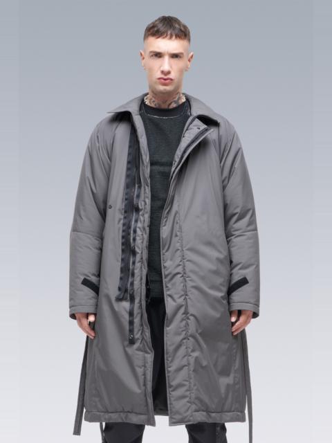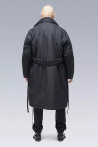 The over-overcoat. Built around a core of Climashield® continuous filament insulation and with a shell of 2-layer Gore-Tex Infinium™ Windstopper®, J99 is a floating cloud fortress of winter well-being. It's sophisticated (180+ pattern pieces) multi-panel ergonomic shape will envelop almost any outfit, and it's seemingly endless list of features and details will meet almost any demand. Of particular note are the multi-stage and multi-position center front storm flaps and collar, the fully taped 'film-out' stowable storm hood, the internal SpeedLockǽ waist gaiter for air compartmentalisation, and an all new integrated JacketSlingǽ that disappears inside the waist of the coat when not in use. [ Shown in size: M. Fits: WIDE. ] Fabric technology 2L GORE-TEX INFINIUM™ WINDSTOPPER® shell fabric (78% PES, 22% ePTFE) bluesign® certified and with PFC free DWR CLIMASHIELD® continuous filament insulation (100% PES) Lining fabric (100% PES) Hood in 2 Layer ePTFE fabric [ Taped ] Sizing Size S M L XL 1/2 Chest 75 77 79 81 Length 108 111 114 117 Shoulders 19 19.5 20 20,5 Sleeves 64 66 68 70 All measurements in centimeters. Weight: 1340g (size M, color Black, including removable parts) Systems ACRONYM SOUNDǽ (PAT.) Subsystems ForceLockǽ JacketSlingǽ SpeedLockǽ Pockets: 6 _External: 4 _Internal: 2 Includes ForceLockǽ [ Removable ] JacketSlingǽ [ Removable ] Logo tape [ Removable ] Belt [ Removable ] Actual product may differ from images.