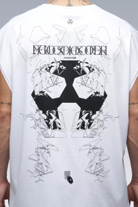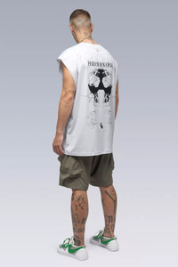 EGO SHOOTER. Oversize fit mercerized cotton interlock sleeveless t-shirt with front and back prints. [ Shown in size: M. Fits: LOOSE ] Fabric technology 100% Cotton (165 g/m²) Mercerized Interlock Made in Portugal Sizing Size XS S M L XL 1/2 Chest 57 60 63 66 69 Length 75 78 81 84 87 Shoulders 21 21.5 22 22.5 23 All measurements in centimeters. Weight: 200g (size M, color Black) Actual product may differ from images.