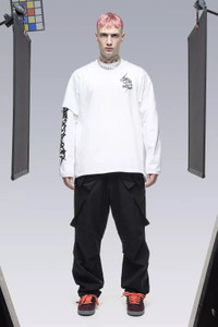 Custom fit organic cotton asymmetric long sleeve t-shirt with front, and right sleeve prints. [ Shown in size: M. Fits: STRAIGHT ] Fabric technology ORGANIC JERSEY (100% CO) Made in Portugal Sizing Size XS S M L XL 1/2 Chest 56 59 62 65 68 Length 69 72 75 78 81 Shoulders 19 19,5 20 20,5 21 Sleeves 55 57 59 61 63 All measurements in centimeters. Weight: 316g (size M, color Black) Actual product may differ from images.