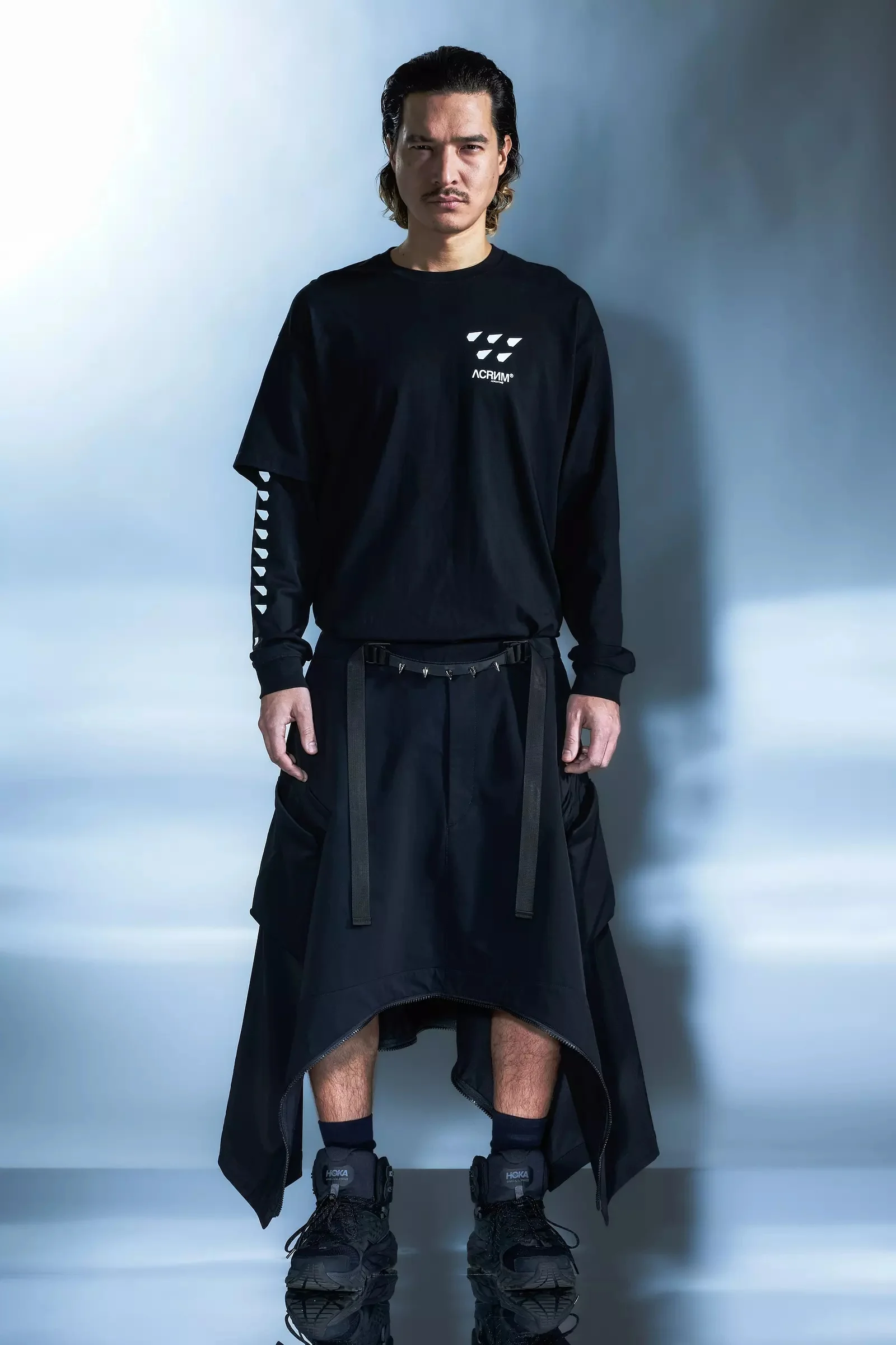 Custom fit 100% cotton long sleeve t-shirt with asymmetric right side double sleeve. [ Shown in size: M. Fits: STRAIGHT ] Fabric technology 100% CO Silk screen print with water-based ink Sizing Size XS S M L XL 1/2 Chest 53 56 59 62 65 Length 73 75 77 79 81 Shoulders 19.5 20 20.5 21 21.5 Sleeves 58 60 62 64 66 All measurements in centimeters. Weight: 356g (size M, color Black) Actual product may differ from images.