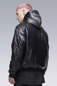 Tech bubble. Ultralight hooded insulator with concealed zip pocket, new semi-internal JacketSlingǽ, and dimensional flex laminate cuffs and hem. Imagine a sweatshirt. Now imagine everything about that sweatshirt redesigned by Acronym and crossbred with a sleeping bag. A halo of liquid comfort that floats between inner and outer layers like no other garment. Standard hoody drawstrings have been replaced with our proven rapid adjust tape (two layers of tape stitched together to form an 'x' cross section, allowing the tape to 'lock-in' when knotted, yet also remain easy to untie). New semi-internal mount brings full JacketSling functionality to drop-in shells. JacketSlingǽ disappears into and emerges from the garment lining smooth as magic. Dimensional flex laminate cuffs utilise spatial distortion for elasticity, a waterproof breathable membrane for water resistance, and will not retain water even if submerged. Please note: HD Nylon fabric will become slightly more matte with time and washing. [ Shown in size: M. Fits: STRAIGHT ] Fabric technology HD NLYON with PRIMALOFT® GOLD INSULATION ACTIVE (133g/m²) Shell: 100% PA Insulation: 100% PES Lining: 100% PES Sizing Size XS S M L XL 1/2 Chest 61 64 67 70 73 Length 63,5 66,5 69,5 72,5 75,5 Shoulders 19 19,5 20 20,5 21 Sleeves 59,5 61,5 63,5 65,5 67,5 All measurments in centimeters. Weight: 465g (size M, color: Black, including removable parts) Subsystems JacketSlingǽ Pockets: 1 _External: 1 _Internal: 0 Includes JacketSlingǽ [ Removable ] Actual product may differ from images.