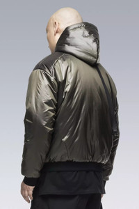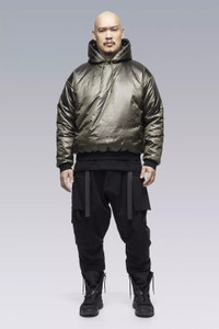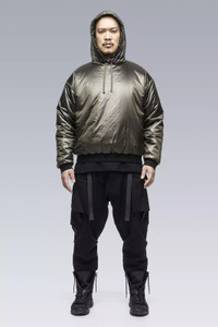 Tech bubble. Ultralight hooded insulator with concealed zip pocket, new semi-internal JacketSlingǽ, and dimensional flex laminate cuffs and hem. Imagine a sweatshirt. Now imagine everything about that sweatshirt redesigned by Acronym and crossbred with a sleeping bag. A halo of liquid comfort that floats between inner and outer layers like no other garment. Standard hoody drawstrings have been replaced with our proven rapid adjust tape (two layers of tape stitched together to form an 'x' cross section, allowing the tape to 'lock-in' when knotted, yet also remain easy to untie). New semi-internal mount brings full JacketSling functionality to drop-in shells. JacketSlingǽ disappears into and emerges from the garment lining smooth as magic. Dimensional flex laminate cuffs utilise spatial distortion for elasticity, a waterproof breathable membrane for water resistance, and will not retain water even if submerged. Please note: HD Nylon fabric will become slightly more matte with time and washing. [ Shown in size: M. Fits: STRAIGHT ] Fabric technology HD NLYON with PRIMALOFT® GOLD INSULATION ACTIVE (133g/m²) Shell: 100% PA Insulation: 100% PES Lining: 100% PES Sizing Size XS S M L XL 1/2 Chest 61 64 67 70 73 Length 63,5 66,5 69,5 72,5 75,5 Shoulders 19 19,5 20 20,5 21 Sleeves 59,5 61,5 63,5 65,5 67,5 All measurments in centimeters. Weight: 465g (size M, color: Black, including removable parts) Subsystems JacketSlingǽ Pockets: 1 _External: 1 _Internal: 0 Includes JacketSlingǽ [ Removable ] Actual product may differ from images.