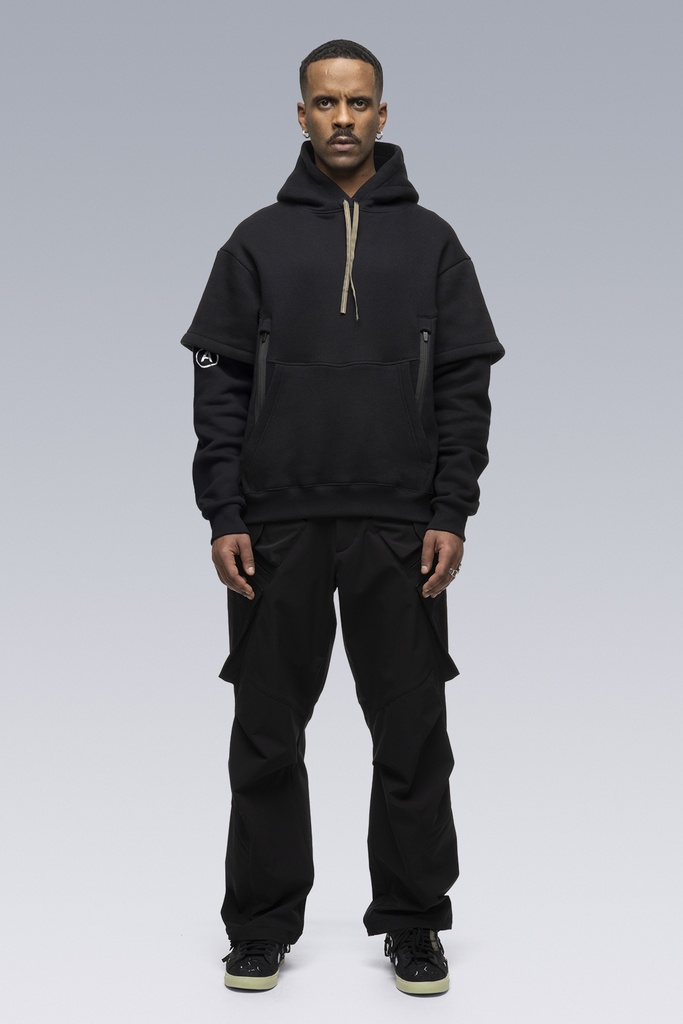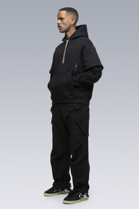 Custom fit cotton hooded sweatshirt with doubled sleeves and a partially hidden right sleeve print. Classic kangaroo pocket joined by dual holster position security pockets with size reverse coild zip closures. Standard hoody drawstrings have been replaced with our proven rapid adjust tape (two layers of tape stitched together to form an 'x' cross section, allowing the tape to 'lock-in' when knotted, yet also remain easy to untie [ Shown in size: M. Fits: STRAIGHT ] Fabric technology HEAVY JERSEY (100% CO) Made in Portugal Sizing Size XS S M L XL 1/2 Chest 61 64 67 70 73 Length 64 67 70 73 76 Shoulders 16 16.5 17 17.5 18 Sleeves 64 66 68 70 72 All measurements in centimeters. Weight: 990g (size M, color Black) Subsystems Pockets: 4 _External: 4 _Internal: 0 Actual product may differ from images.