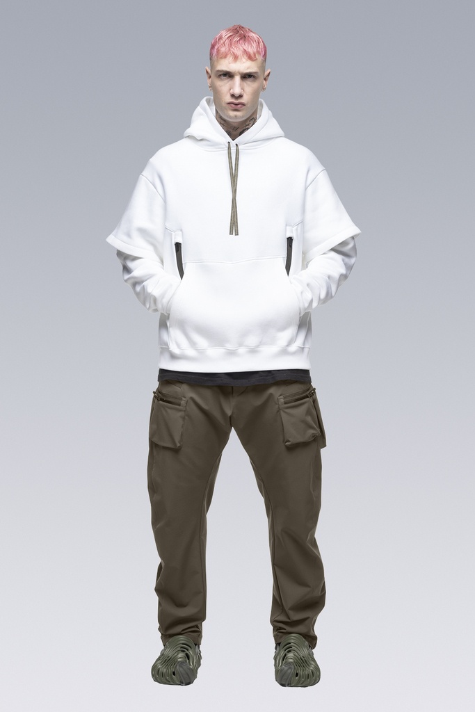 Custom fit cotton hooded sweatshirt with doubled sleeves and a partially hidden right sleeve print. Classic kangaroo pocket joined by dual holster position security pockets with size reverse coild zip closures. Standard hoody drawstrings have been replaced with our proven rapid adjust tape (two layers of tape stitched together to form an 'x' cross section, allowing the tape to 'lock-in' when knotted, yet also remain easy to untie [ Shown in size: M. Fits: STRAIGHT ] Fabric technology HEAVY JERSEY (100% CO) Made in Portugal Sizing Size XS S M L XL 1/2 Chest 61 64 67 70 73 Length 64 67 70 73 76 Shoulders 16 16.5 17 17.5 18 Sleeves 64 66 68 70 72 All measurements in centimeters. Weight: 990g (size M, color Black) Subsystems Pockets: 4 _External: 4 _Internal: 0 Actual product may differ from images.