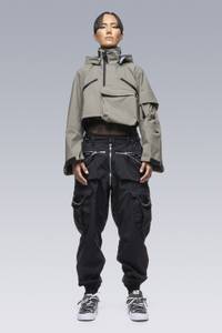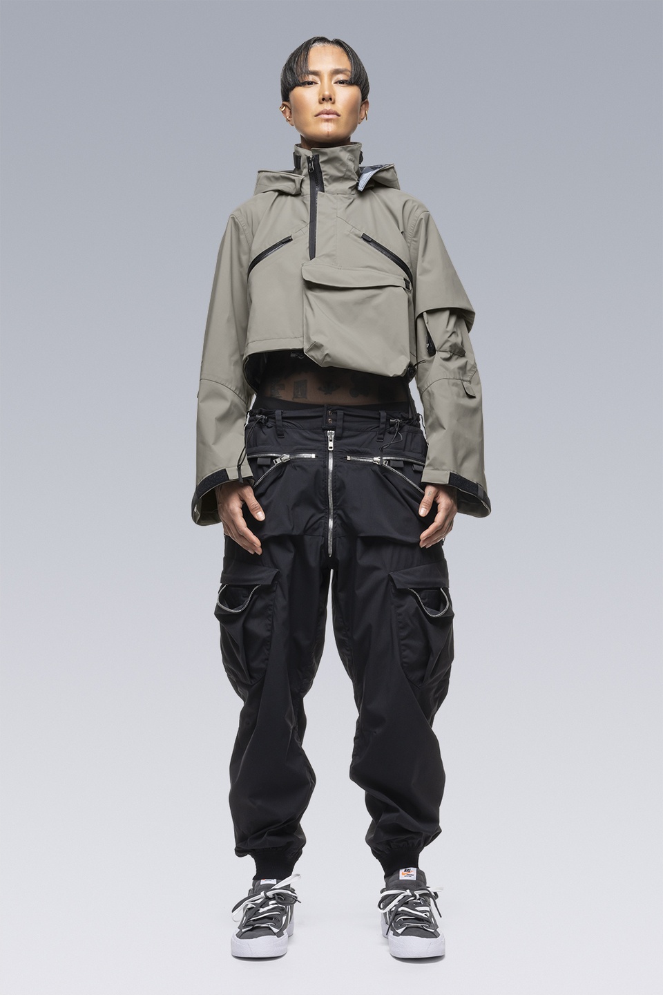 Description J6011 is sacai's aesthetic reframing of the Acronym J1W-GTPL design**. Following sacai methodology, it preserves hallmark attributes while radically altering volume and silhouette. It features both a dramatically truncated length, and striking sleeve and shoulder of exaggerated proportions. Made in Japan by sacai. Shown in size: 2/M (Fa', 180 cm), and 2/M (Errolson, 183 cm.) [ Fits: Ultrawide ] **sacai man 2022 Spring & Summer, women's 2022 Pre Spring collection Riffing on a theme of bonding, both as a metaphor for unity and as a technique for joining together two materials - two ideas that have been at the heart of sacai since the beginning. The collection by founder and designer, Chitose Abe, is a study on sealing together two apparently disparate notions to make a new form, bringing together characteristics born of different, sometimes opposing, origins. The ultimate expression of the idea comes courtesy of a collaboration with ACRONYM®, combining the designer Errolson Hugh's signature technical details with sacai fabrics and shapes for men and women, and, for the first time for ACRONYM®, a dress silhouette. Hugh says, 'Having known Chitose, and of course sacai, for many years, this collaboration is the ideal kind of crosspollination. And as I believe you can see from the results, it's a true blend of the philosophies of both brands, where the sum is greater than the parts.' Fabric Technology 72% PA, 28% ePTFE Sizing S M L XL 1 2 3 4 1/2 Chest 78 80 82 84 Length 40,5 42 43,5 45 Shoulders 15,5 16 16,5 17 Sleeves 60 61,5 63,5 65 All measurements in centimeters. Weight: 668 g (size M, including removable parts)