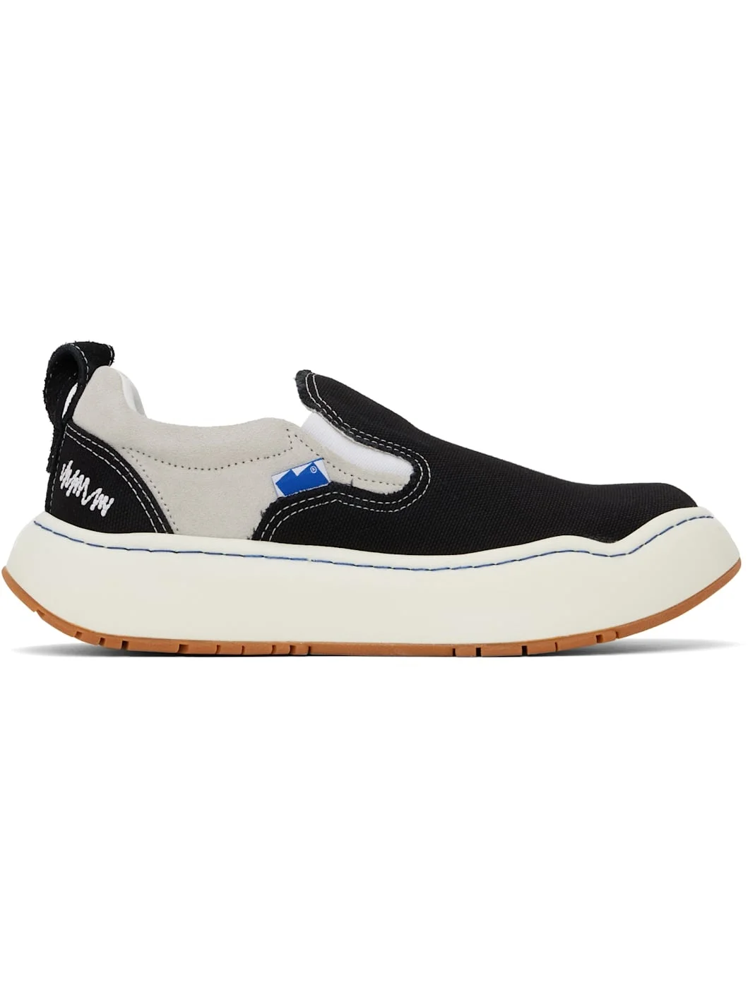 Low-top canvas and suede slip-on sneakers in black. · Elasticized gussets at vamp · Raw edge at padded tongue · Padded collar · Logo flag at outer side · Logo graphic embroidered at outer side · Twisted pull-loop at heel tab · Grained leather and canvas lining · Logo embossed at rubber midsole · Treaded rubber sole · Contrast stitching in off-white Supplier color: Black Upper: textile, leather. Sole: rubber. Made in South Korea 251039M237004