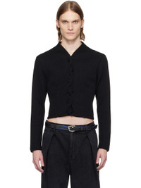 Knit polyester cardigan. · V-neck · Twisted button closure · Curved cropped hem · Cutouts and twisted detailing at back · Frayed flag with topstitching at back hem Supplier color: Noir 100% polyester. Made in South Korea 251039M200007
