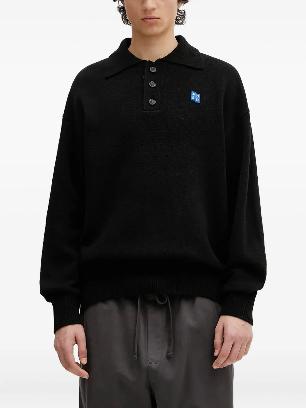 polo-neck logo-patch sweater Highlights - Black - Wool-cotton blend - Polo neck - Three-button placket - Long sleeves - Small logo patch Imported Composition Wool 77%, Cotton 23% Washing instructions Read Manufacturer Guidelines