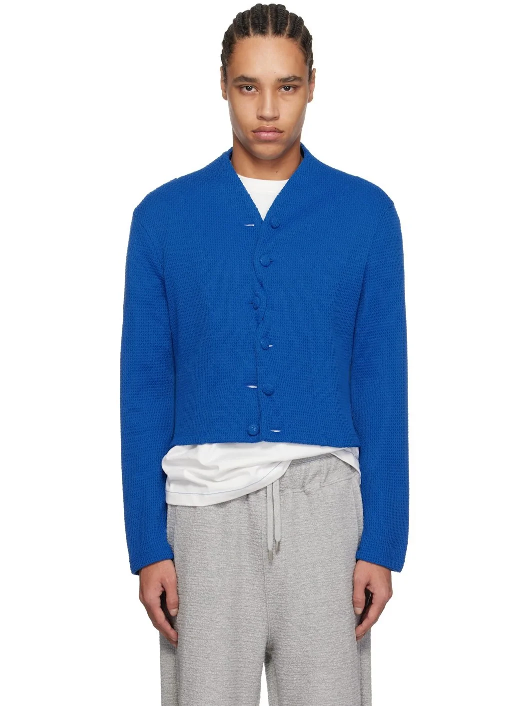 Knit polyester cardigan. · Y-neck · Twisted button closure · Cutouts and twisted detailing at back · Frayed logo flag with topstitching at back Supplier color: Blue 100% polyester. Made in South Korea 251039M200006