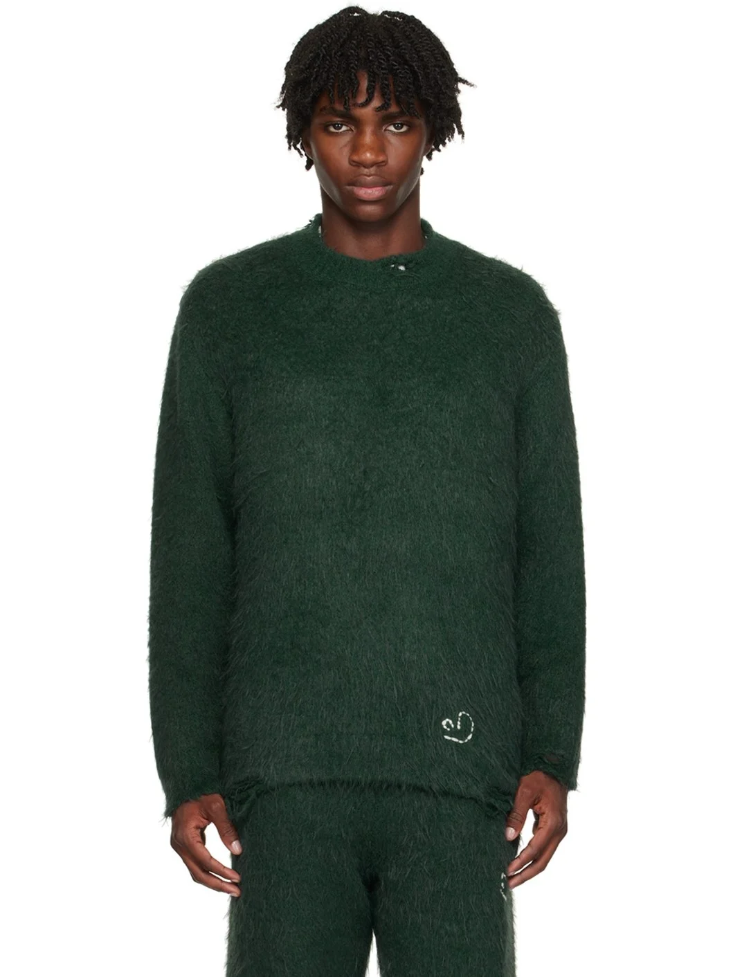 Brushed knit nylon- and wool-blend sweater. Distressing throughout. · Rib knit crewneck, hem, and cuffs · Logo graphic embroidered at front and back · Dropped shoulders · Thumbhole at cuffs Supplier color: Green 60% nylon, 40% wool. Made in South Korea 232039M201002