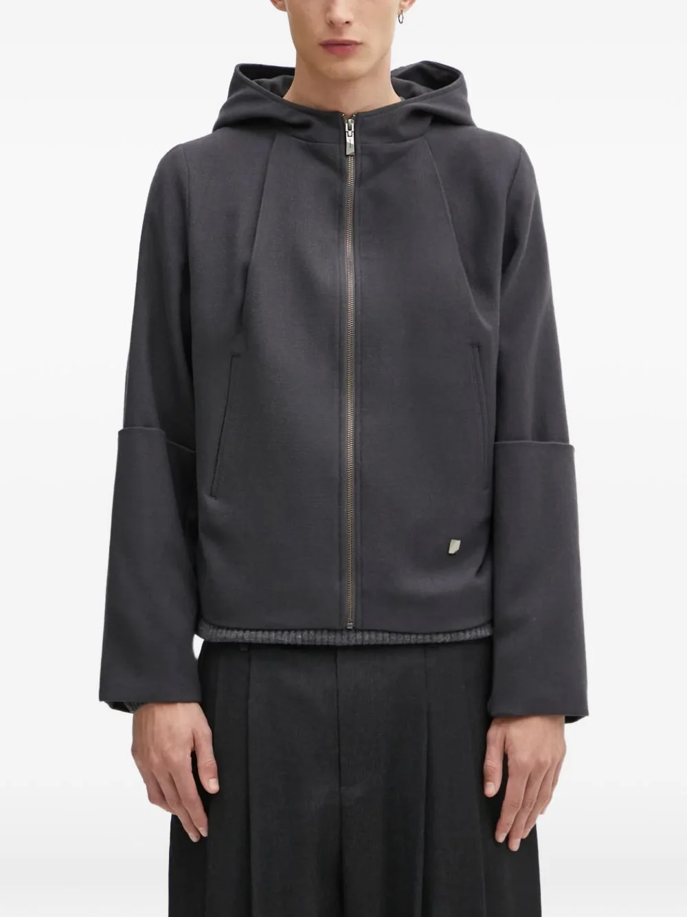 hooded zip jacket Highlights - Grey - Hood - Zip fastening - Front welt pockets - Long sleeves Imported Composition Outer: Wool 100% Lining: Polyester 55%, Rayon 45% Washing instructions Dry Clean Only