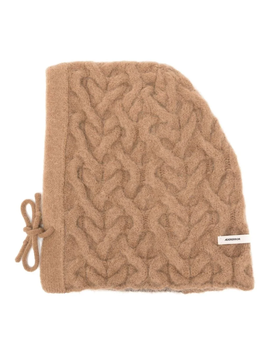 logo-applique cable-knit hat Highlights - Camel brown - Cable knit - Brushed finish - Applique logo - Finished edge - Front tie fastening Imported Composition Nylon 34%, Wool 30%, Mohair 30%, Elastane 6% Washing instructions Do Not Wash/Do Not Dry Clean