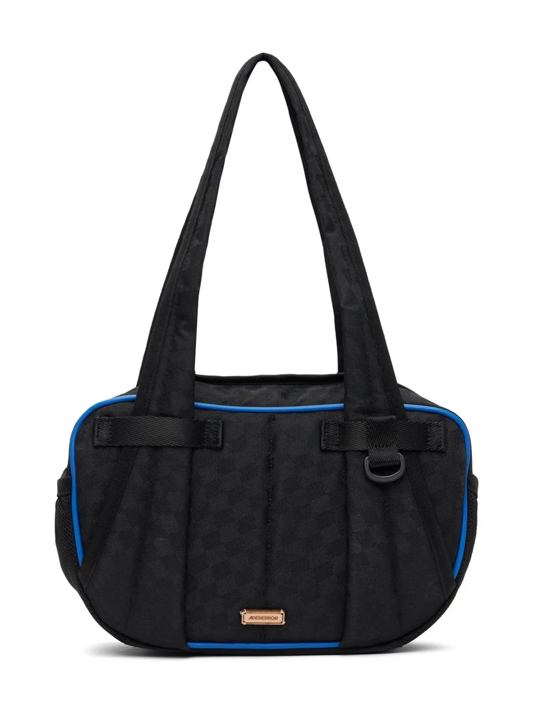 Nylon canvas tote in black. Jacquard check pattern and piping throughout. · Twin padded carry handles · Wooden logo plaque at face · D-ring at face · Mesh patch pocket at sides · Logo flag at side · Elastic strap and patch pocket at back face · Patch pockets at interior · Nylon twill lining · H7 x W11 x D4 in Supplier color: Noir