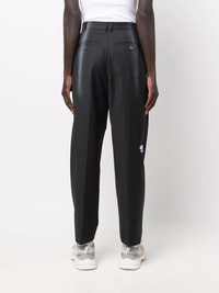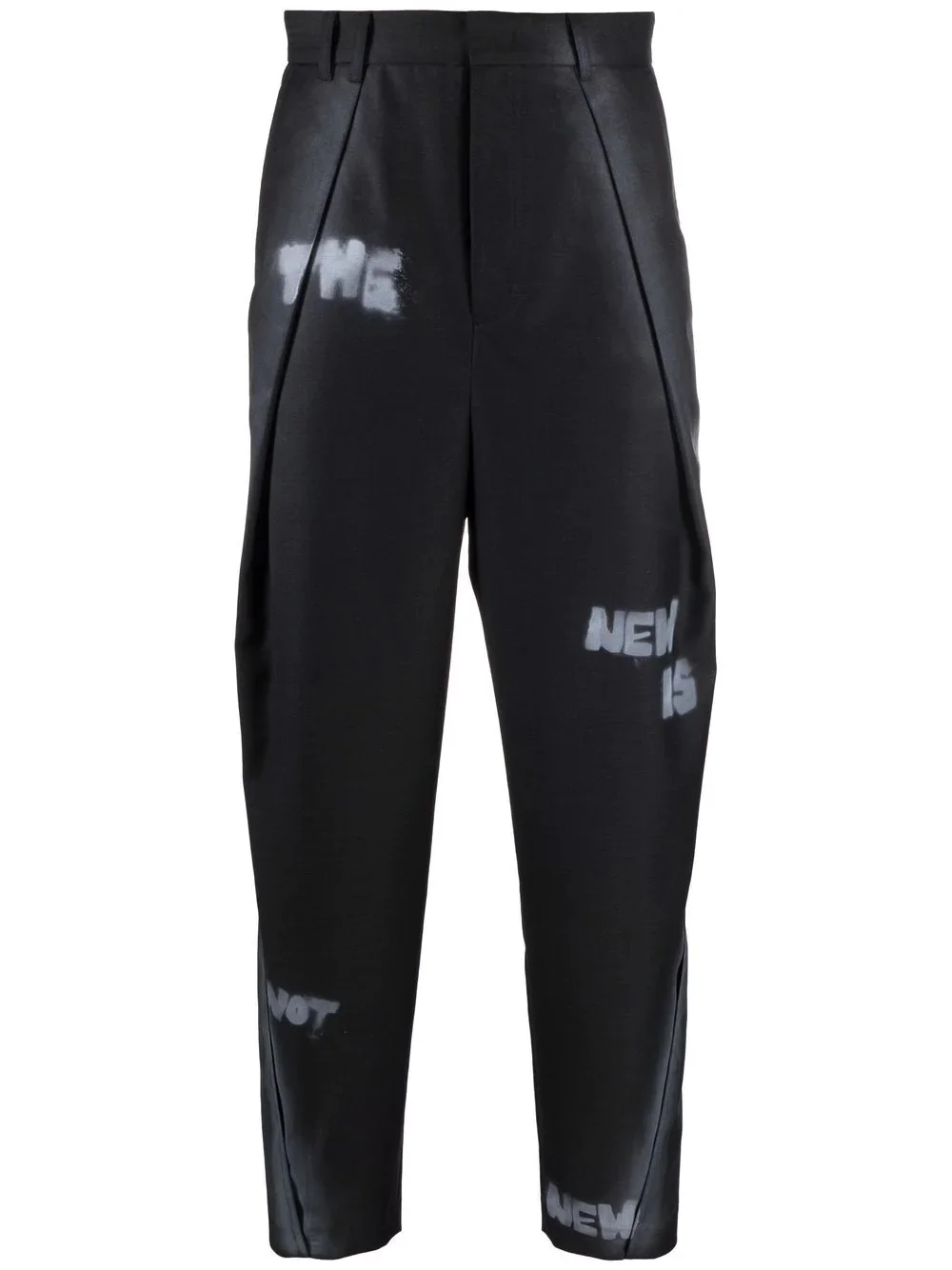 slogan print straight-leg trousers black wool blend slogan print straight leg concealed front fastening belt loops two side slit pockets two rear welt pockets Imported Composition Wool 80%, Polyester 20% SIZE & FIT Model measurements Height 5 ft 10 in(1.78 m) Bust/Chest 33.07 in(84 cm) Hips 35.82 in(91 cm) Waist 25.98 in(66 cm) FittingInformation This piece fits true to size. We recommend you get your regular size Designed to be loose over the leg with a fitted waist and hem Made with a mid-weight non-stretch fabric Washing instructions Dry Clean Only