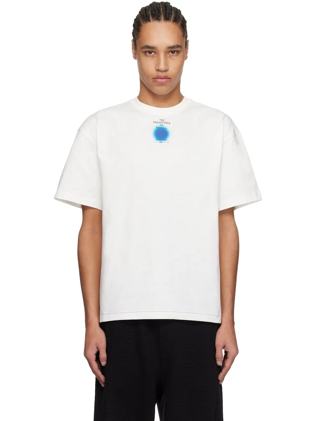 Cotton-blend jersey T-shirt. · Rib-knit crewneck · Logo, graphic, and text printed at chest · Contrast stitching in blue at hem · Dropped shoulders · Frayed logo flag with topstitching at back Supplier color: Off white Body: 73% cotton, 27% polyester. Trim: 96% cotton, 4% elastane. Made in South Korea 251039M213016